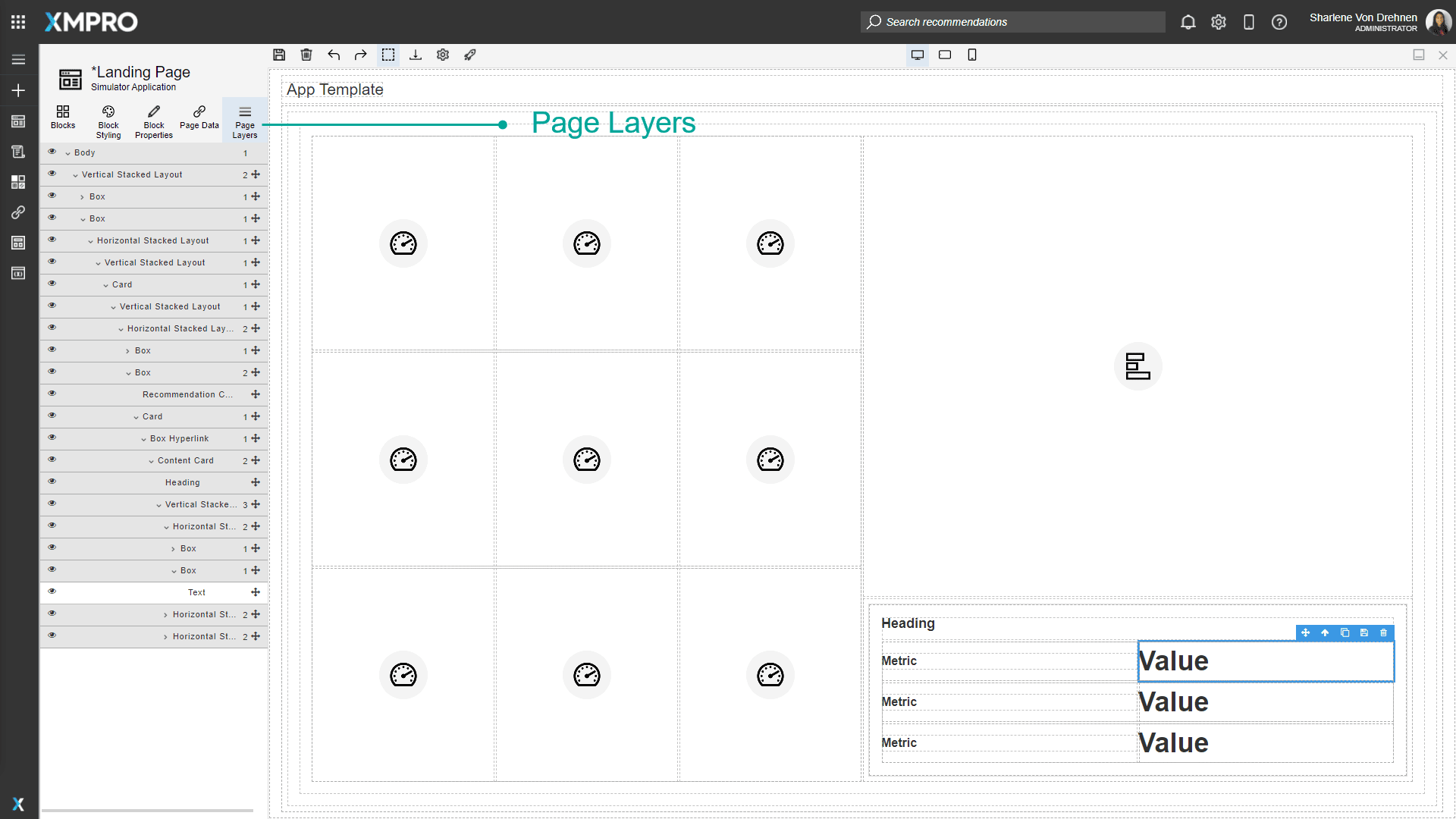 Blocks are organized on the canvas in a hierarchy. The Page Layers tab in the toolbox displays a tree list representation of the hierarchy. This can make selecting blocks simpler and easier as some applications may have many nested layers and it can be difficult to select them on the canvas itself. This allows you to find the exact block you need to manipulate.