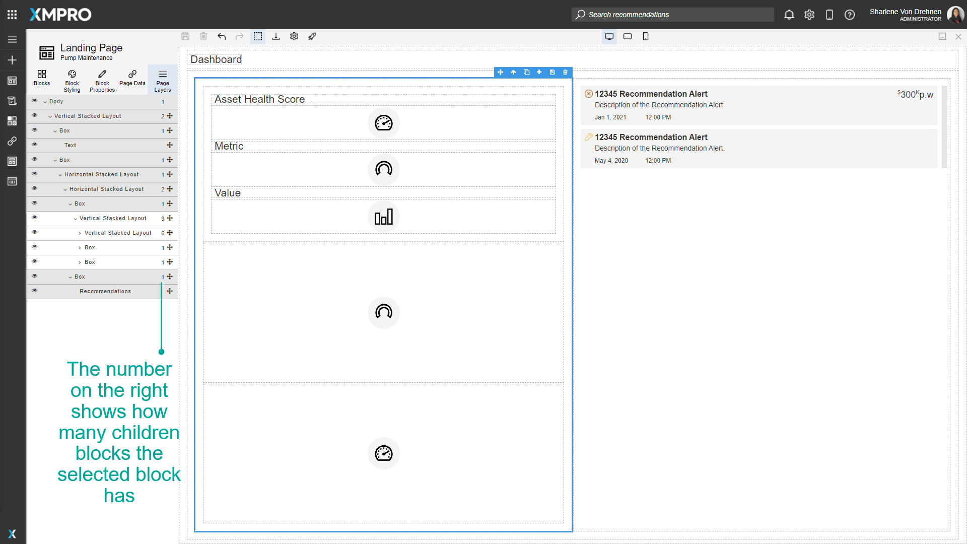 The number on the right shows how many children blocks the selected block has.
