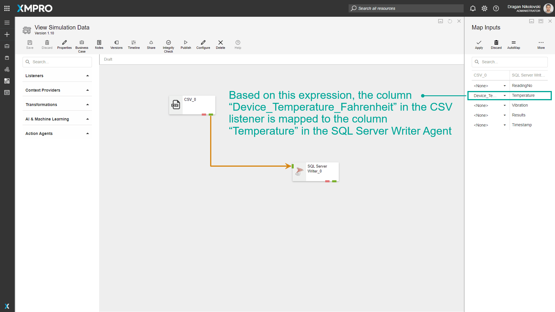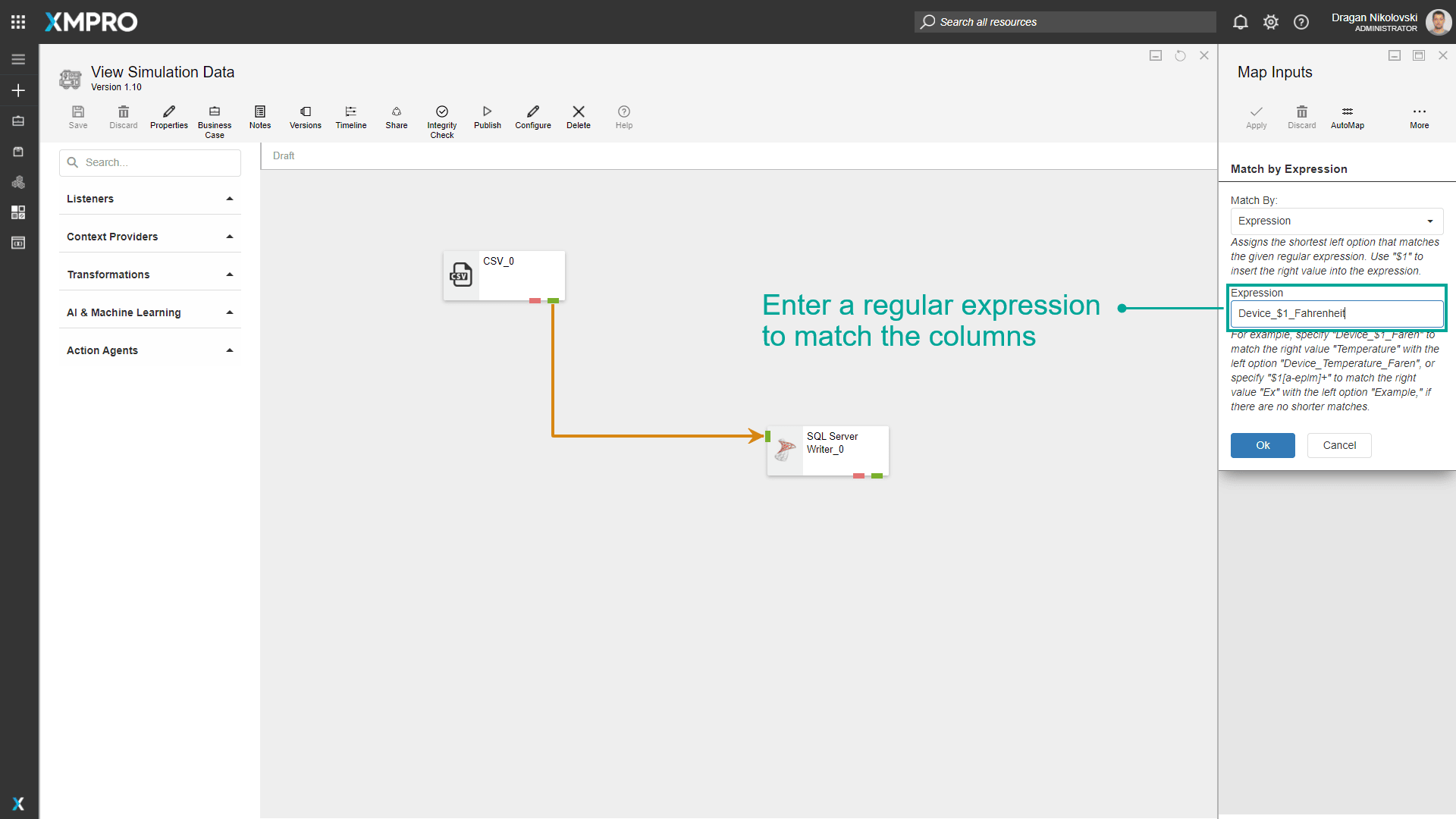 In the images below, “Device_$1_Fahrenheit” is used as the regular expression. Based on this expression, the column “Device_Temperature_Fahrenheit” in the CSV listener is mapped to the column “Temperature” in the SQL Server Writer Agent.