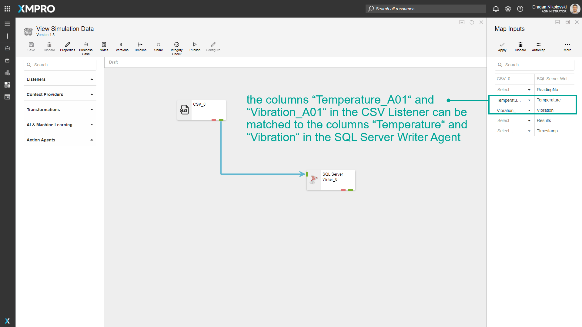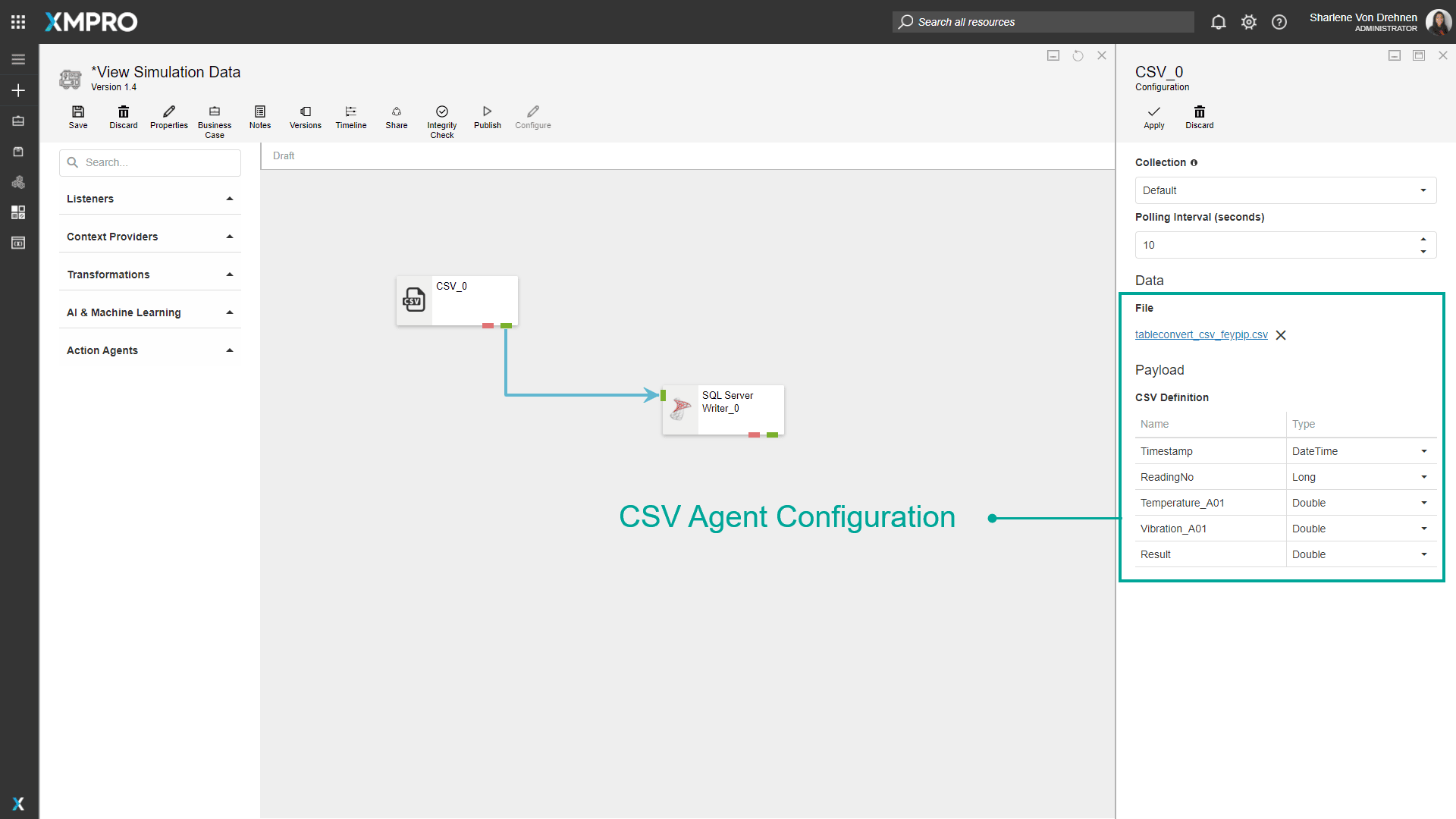 - In the file uploaded to the CSV listener Agent, there are columns named “Temperature_A01“ and “Vibration_A01“