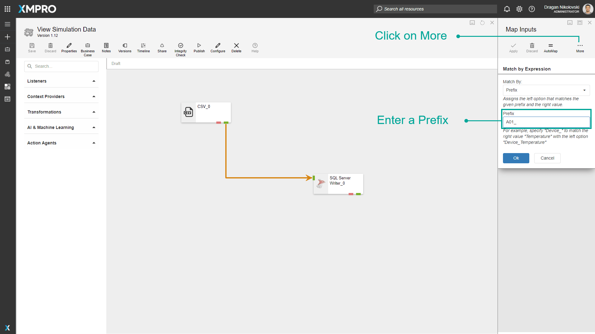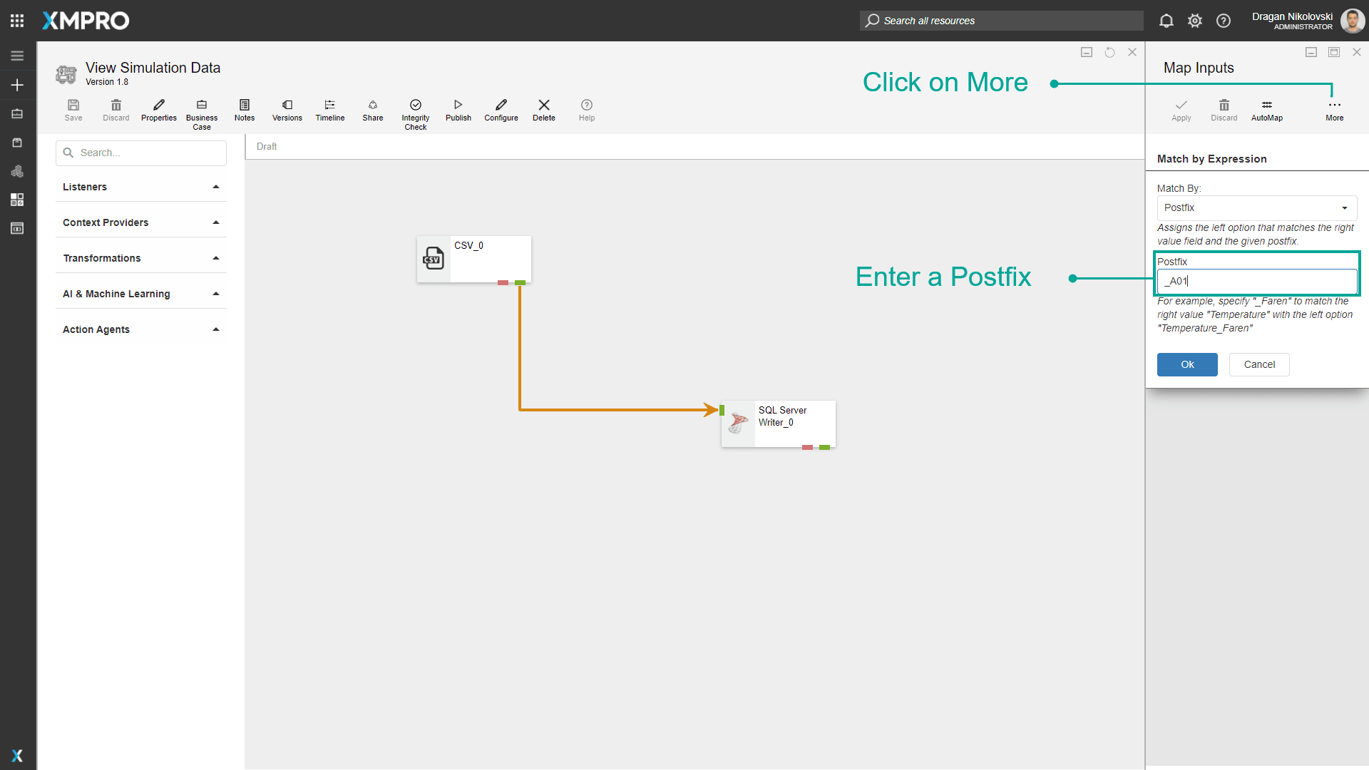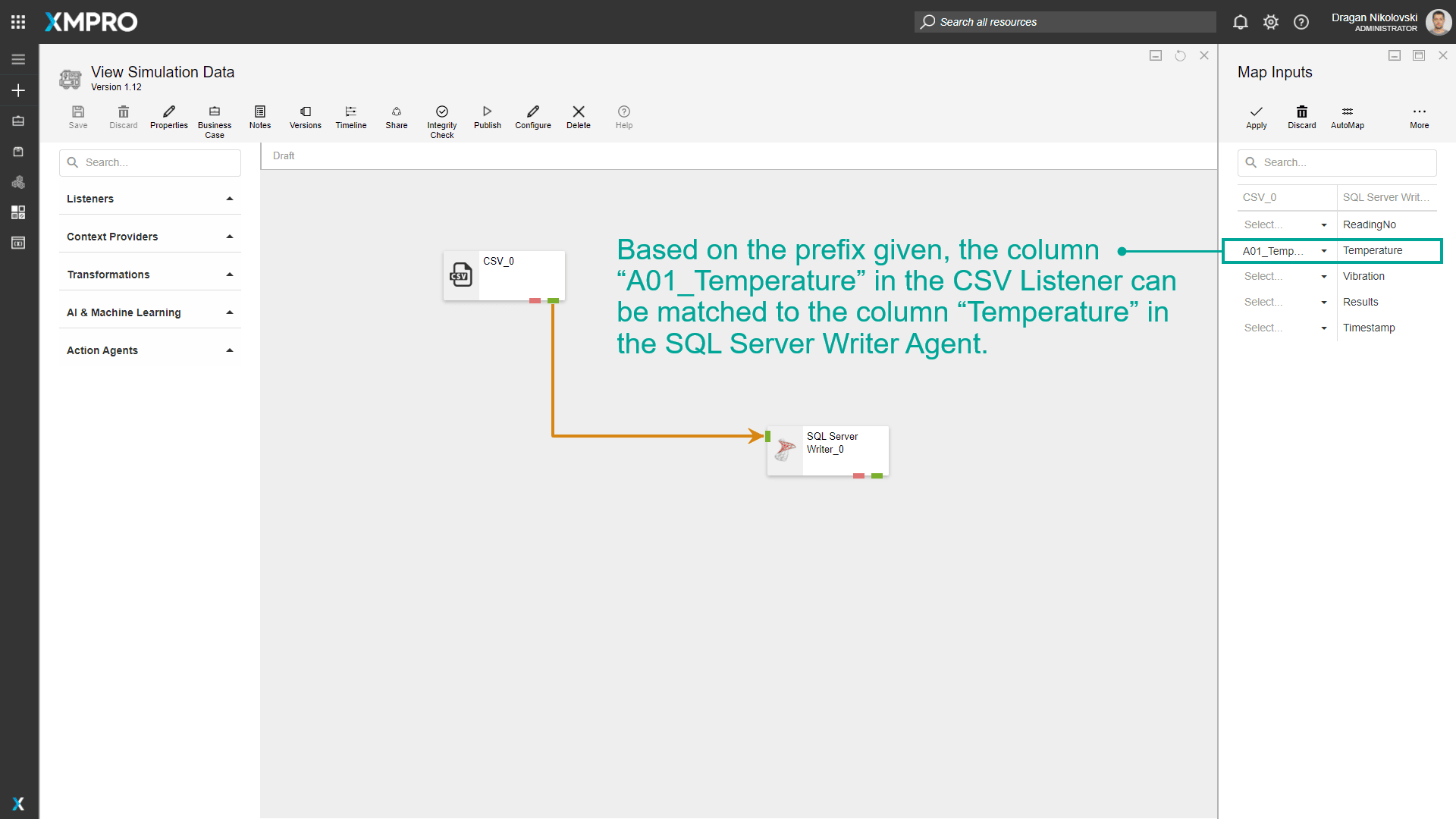 In the images below, “A01” is specified as the postfix. Based on the prefix given, the column “A01_Temperature” in the CSV Listener can be matched to the column “Temperature” in the SQL Server Writer Agent.
