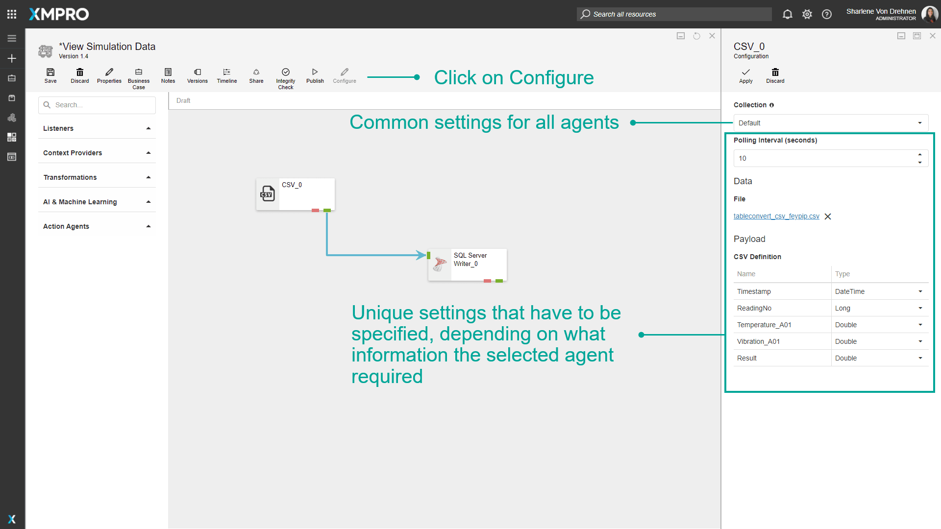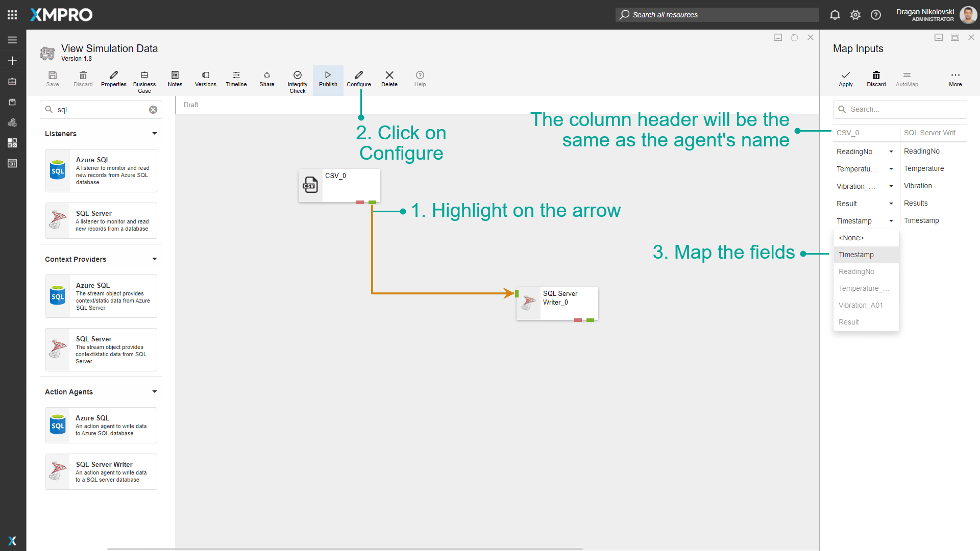 For the data to be written to the database in a specific format, you need to map the correct columns in the CSV file to the correct SQL Server table columns. To do this, both the CSV Listener and the SQL Server Writer Agents need to be configured first. To configure an Agent, click on the Agent and then on the “Configure” button. Fill in all the details required, for example, the SQL Server instance name and credentials.