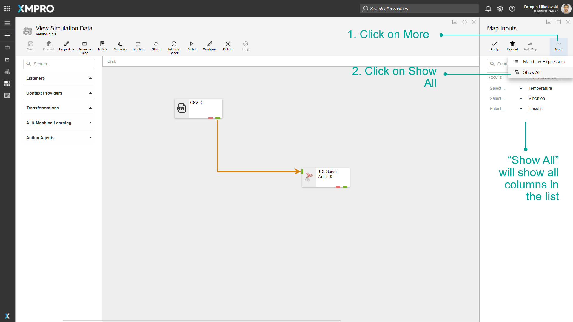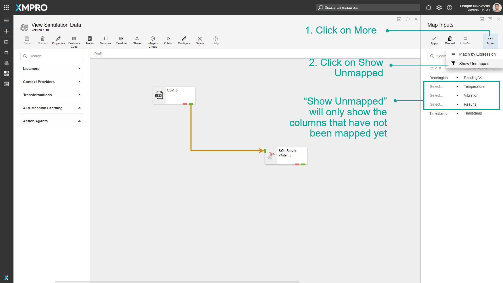 In some cases, you might have to map a large number of inputs for an Agent. Some functions have been implemented to make the process of mapping a large number of fields easier, such as Match by Expression, AutoMap, and Show Unmapped.