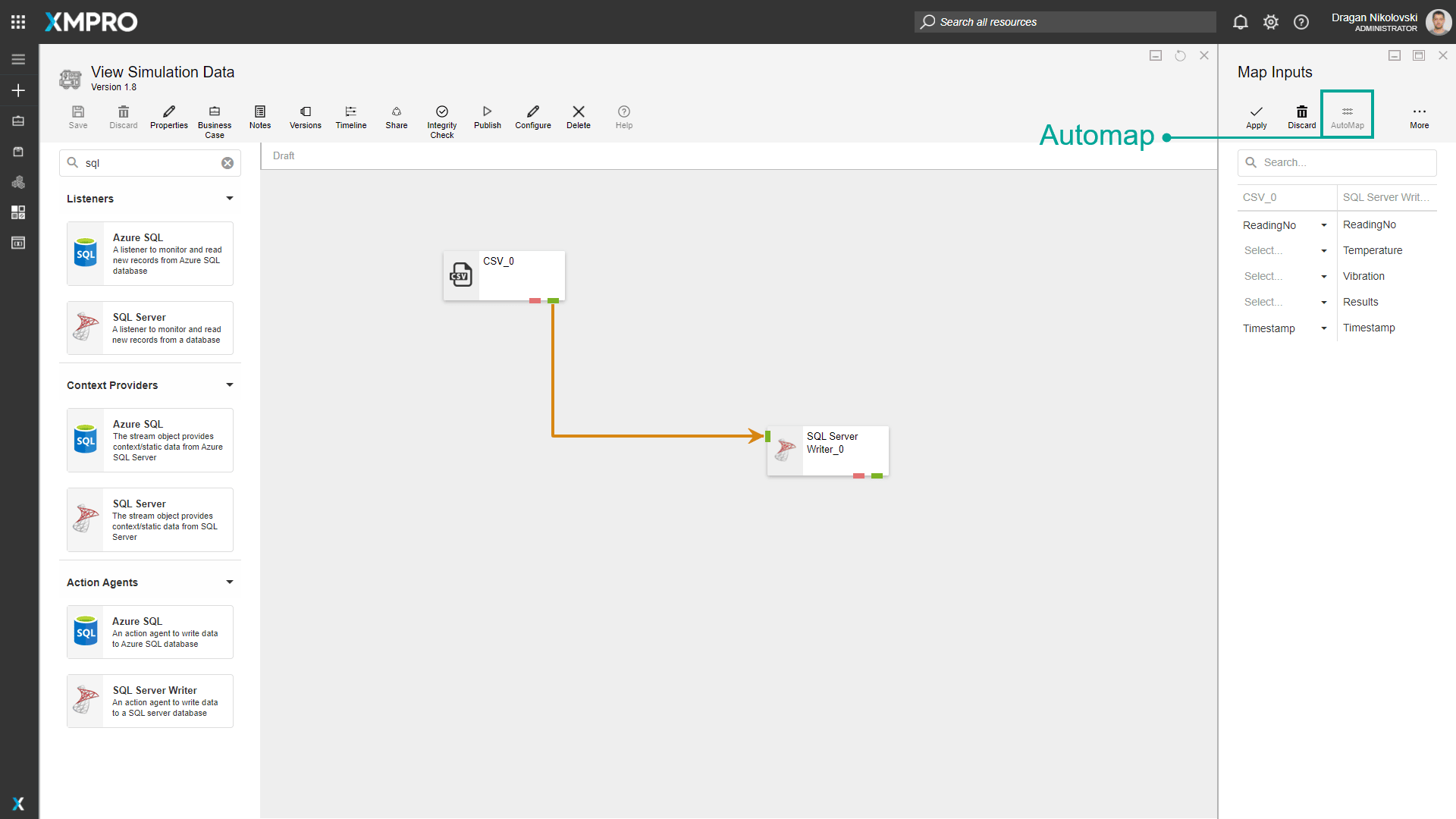 By clicking on the “AutoMap” button, Data Stream Designer will match all the fields that are common between the Agents involved, for example, if you look at the stream in the image below, you will notice that both the SQL Server Writer Agent and the CSV Listener has the fields listed below in common, which will automatically be mapped if they have the same data type.