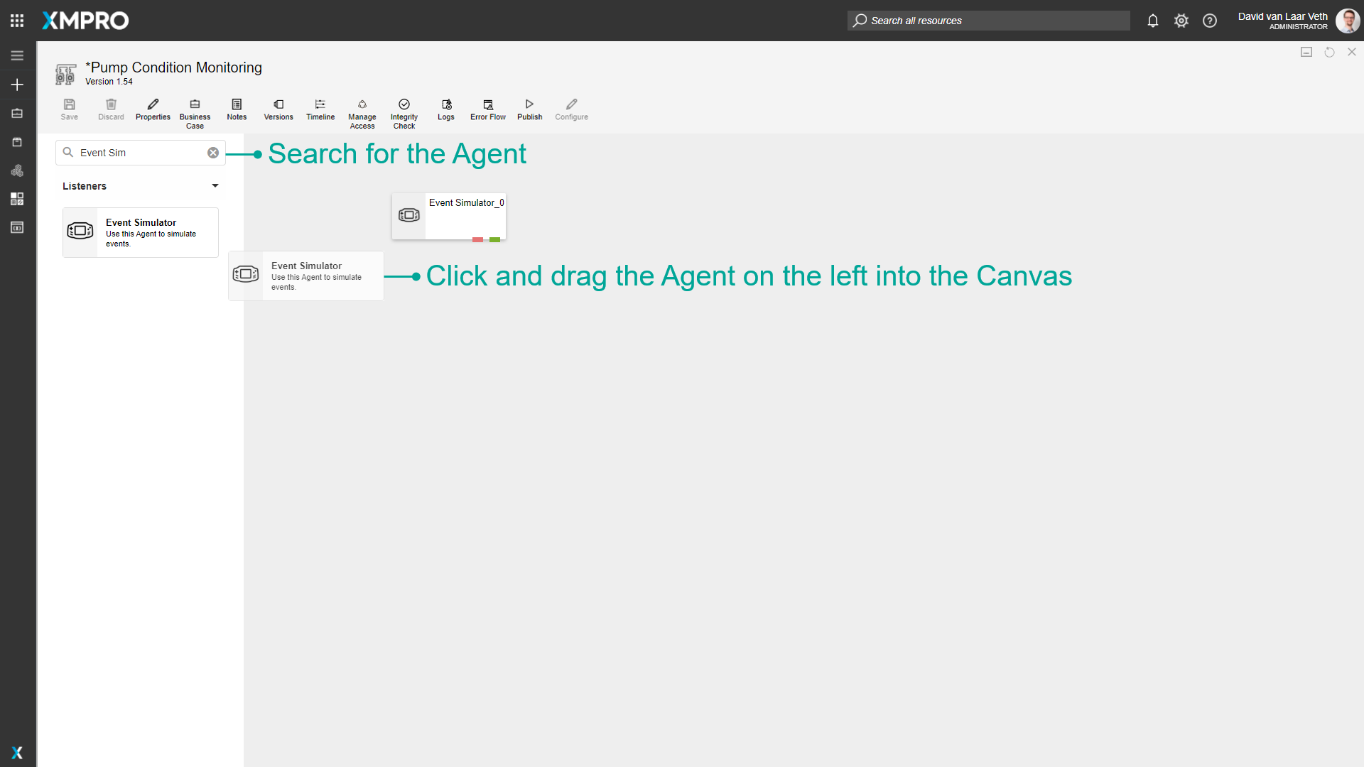 You can search for the Agent in the search bar, and click and drag the Agent into the canvas to add it. An instance of an Agent added to the canvas is referred to as a Stream Object.