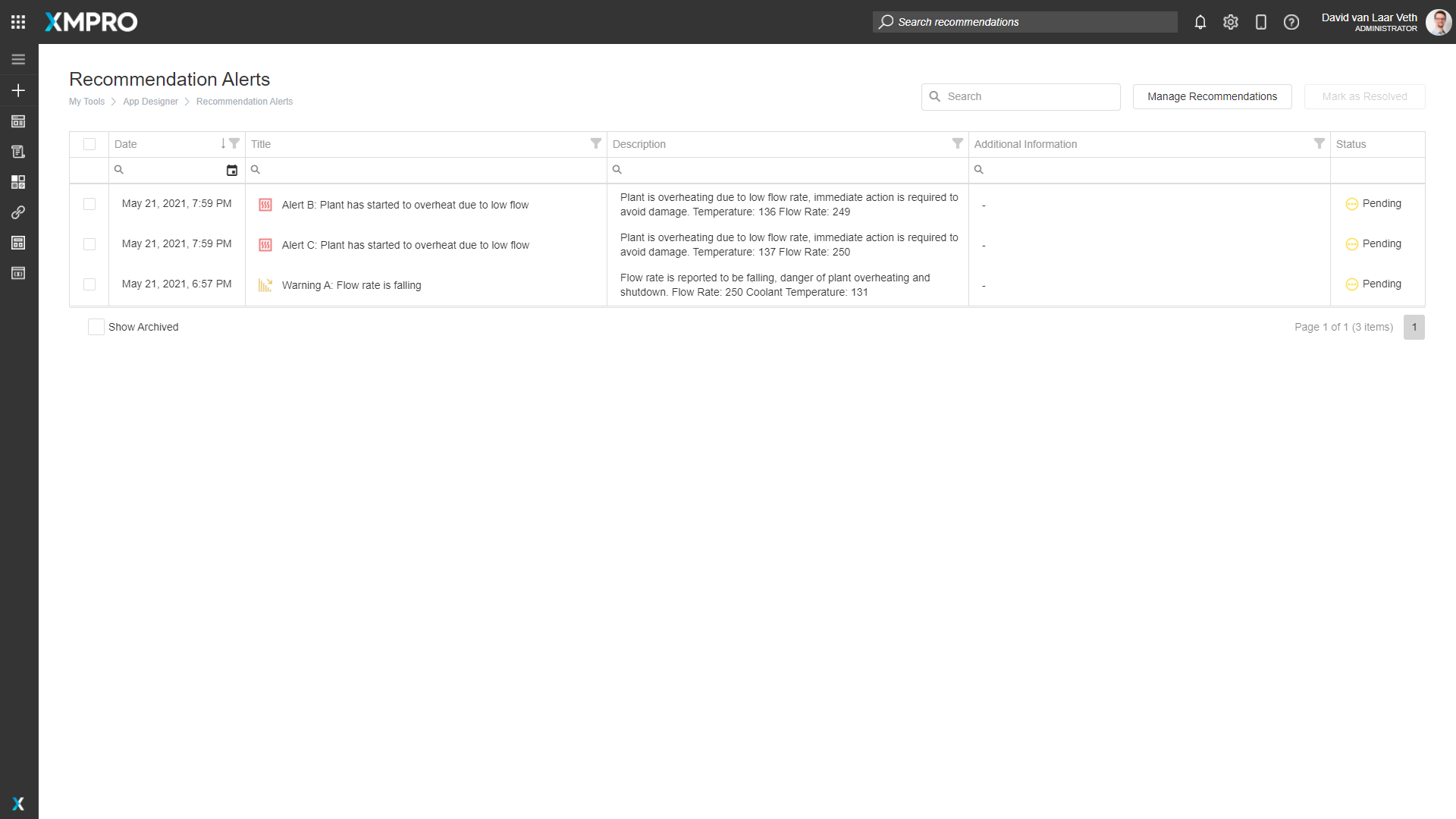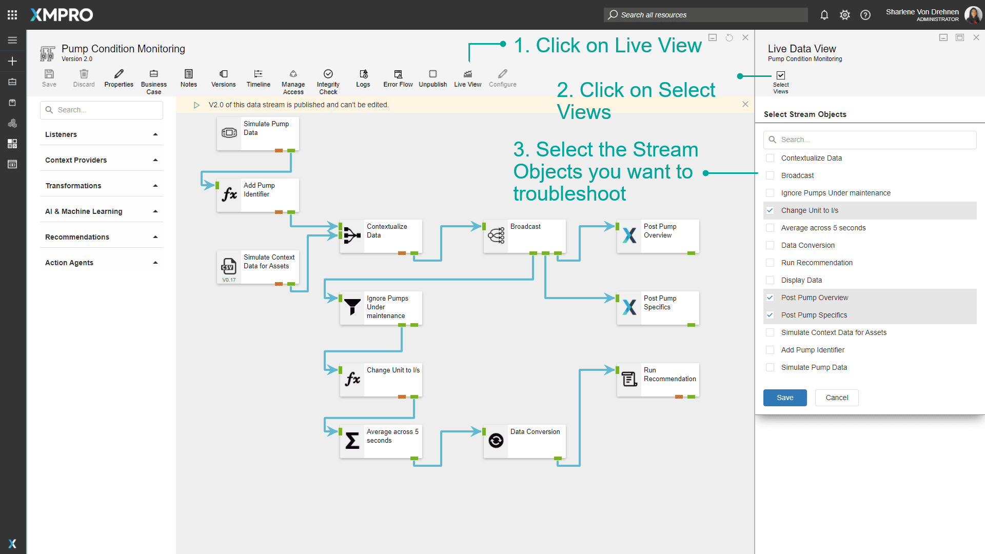 This step-by-step tutorial is meant to be an introduction to using the XMPro platform. Completing it will give you a solid foundation to understand the more advanced concepts and detailed how-to guides. This tutorial will explain how to create and design a Data Stream, configure Stream Objects to ingest, analyze, transform, and perform actions on data. You will also learn how to set up a Recommendation to generate alerts based on rule logic, create and design an App, create Data Sources and Connections, and configure a simple Data Grid and Chart.