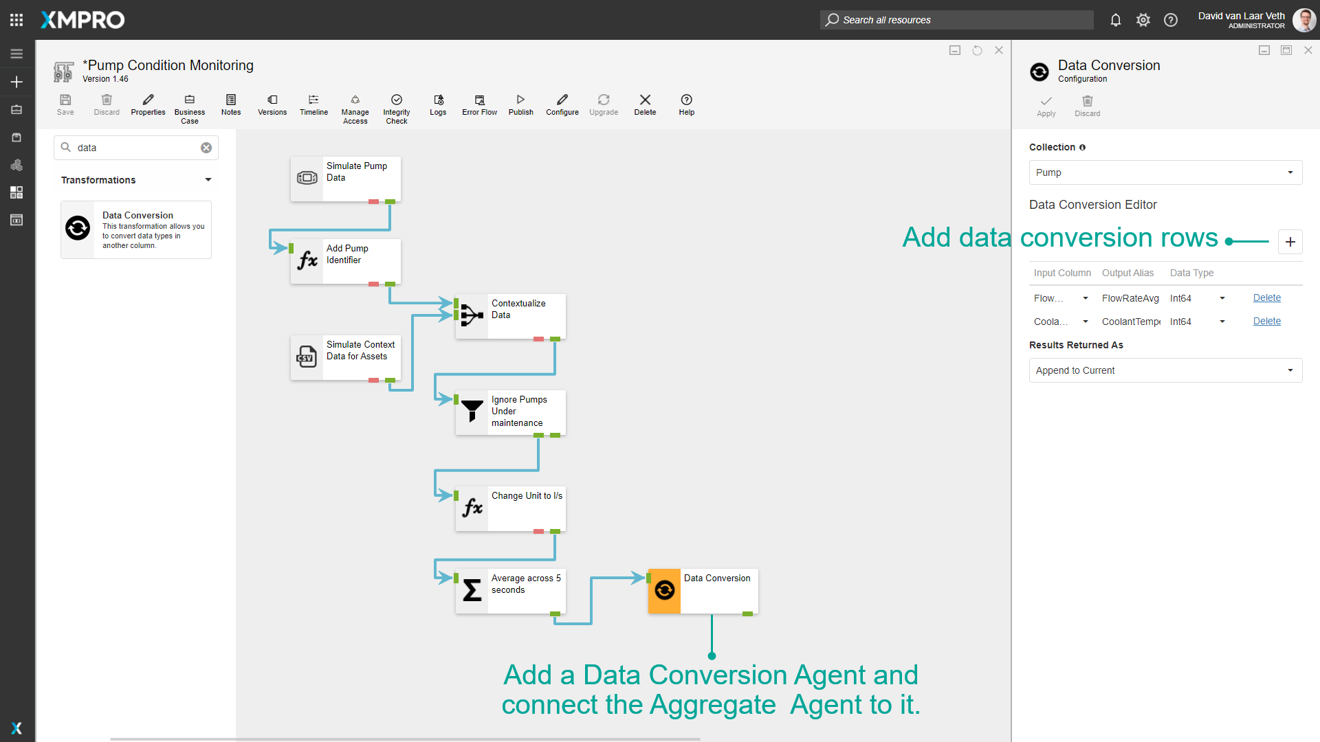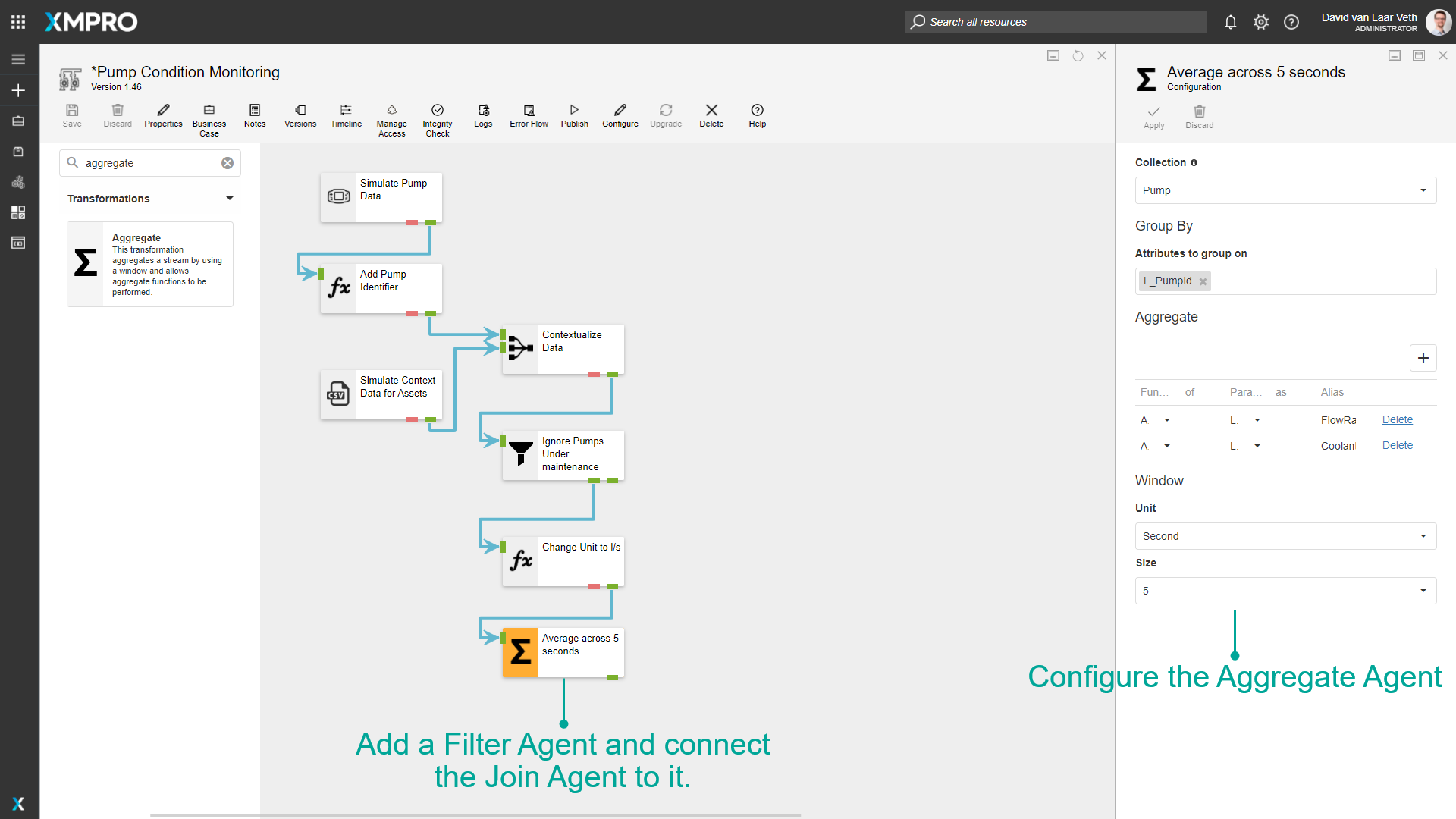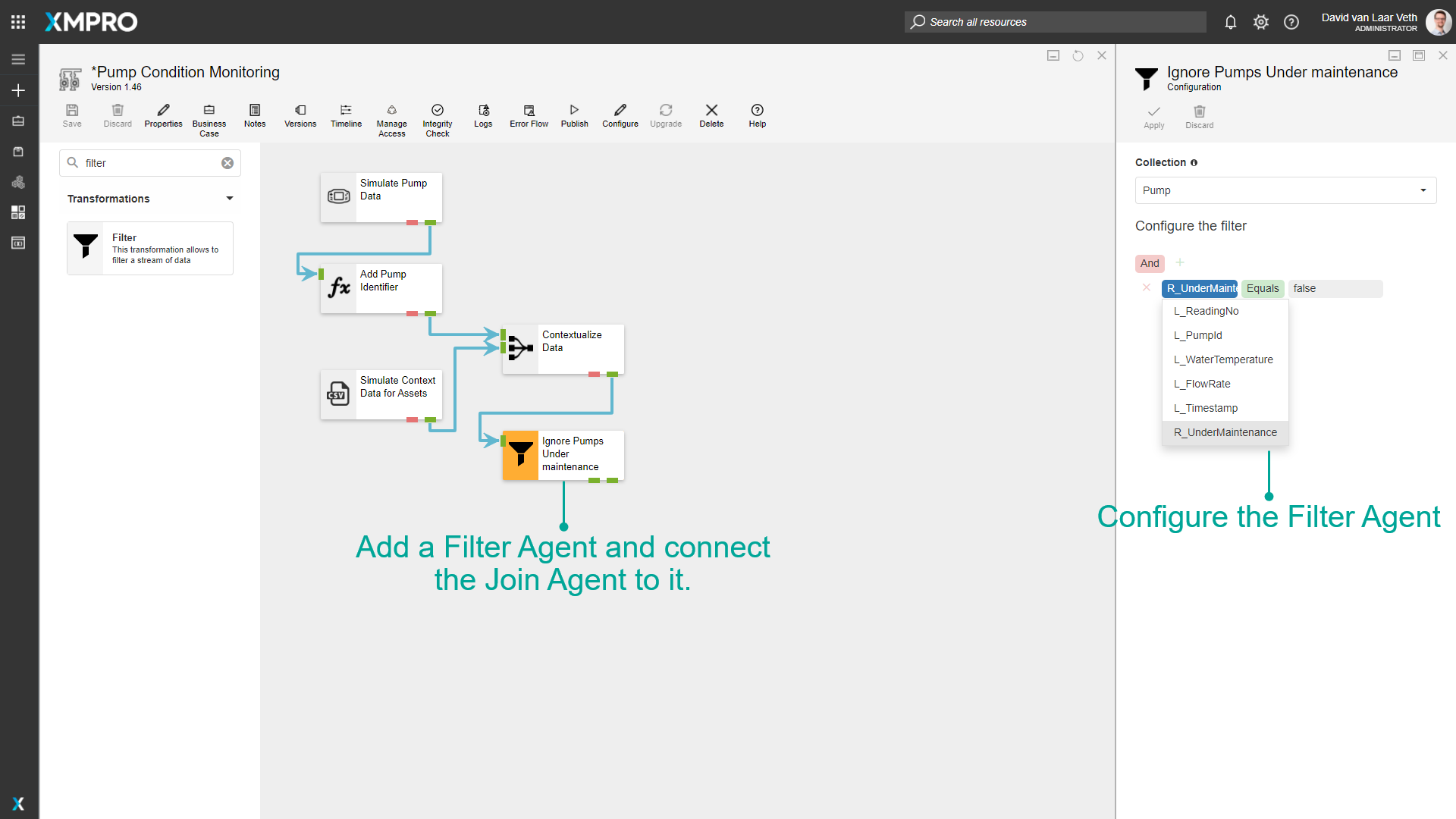 The metadata about each pump needs to be appended to each row of sensor data received from the pumps. This can be achieved with the Join Agent.