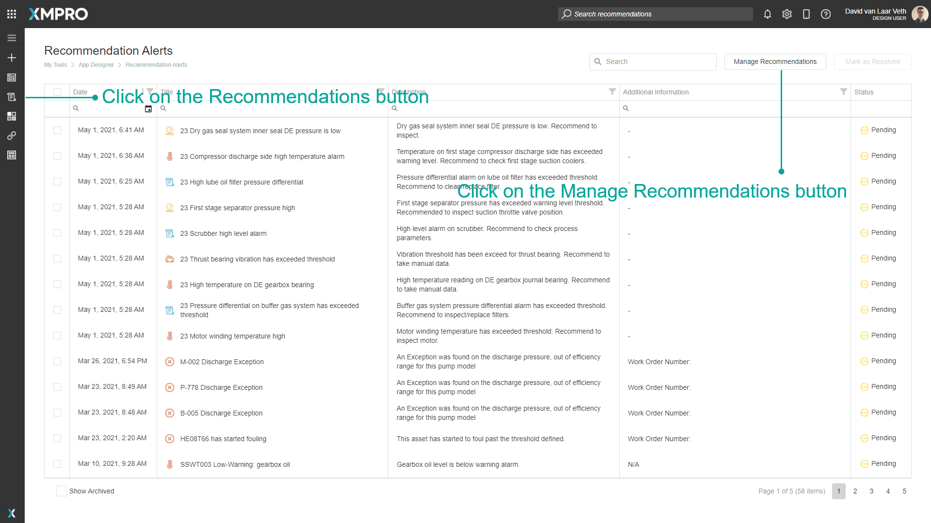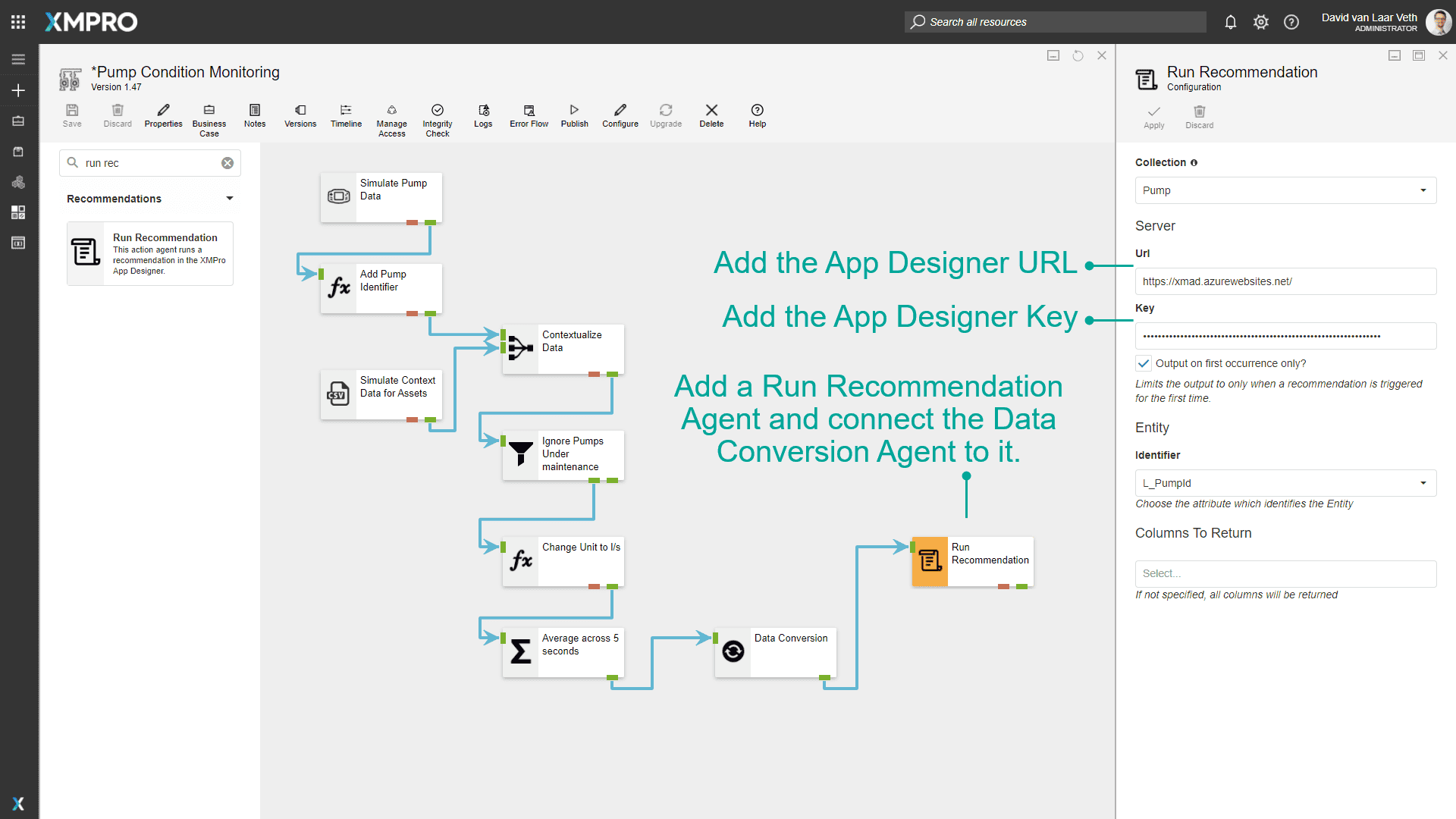 On the Pump Details Page, we only want to show the Recommendation Alerts for the specific pump we're looking at. To do this, Change the Entity ID property to Equals Parameter.PumpId.