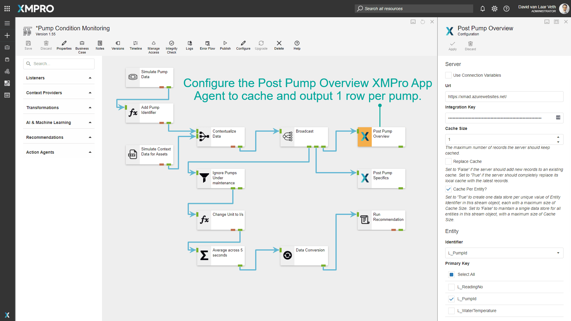 We need to add a way to simulate having three different pumps. At the moment the data is not identified, so we will need to add a range of identifiers to the data. This can be achieved with the Calculated Field Agent. The "Add Pump Identifier" Calculated Field will add a "PumpId" field to the data generated with values "A", "B", and "C" for each subsequent row.