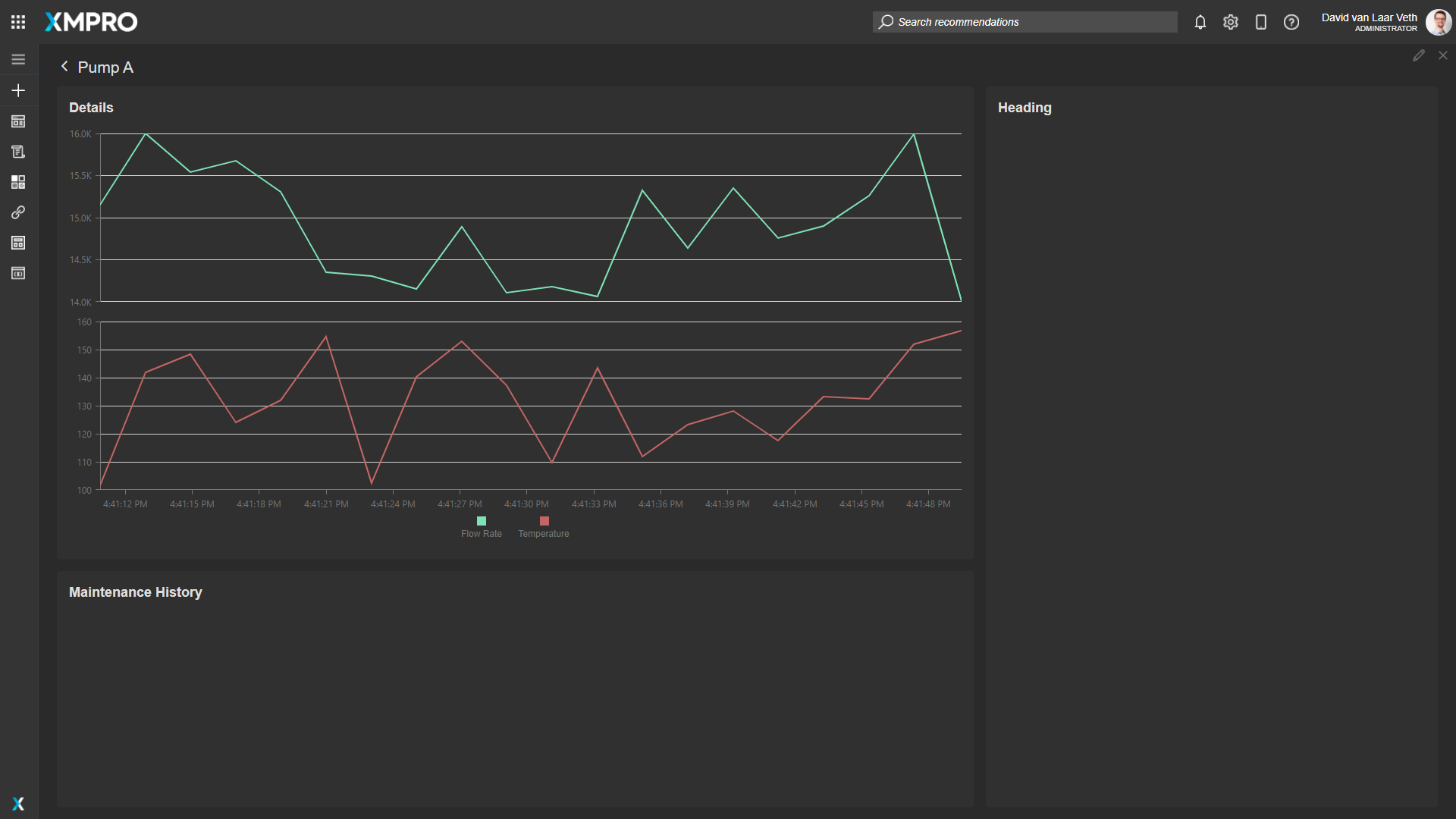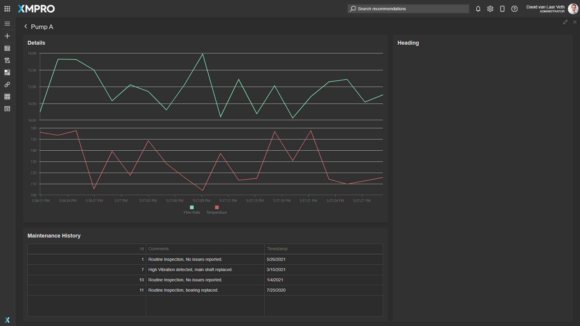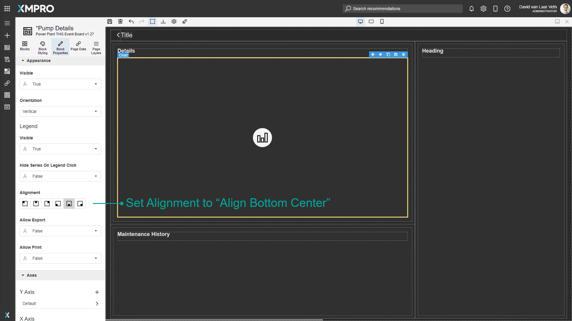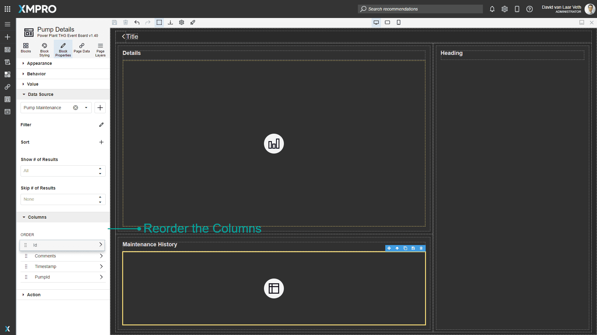 We also want the Headings of the page to explain what is being shown, so change the top-left heading's text to "Details" and the bottom-left heading's text to "Maintenance History".