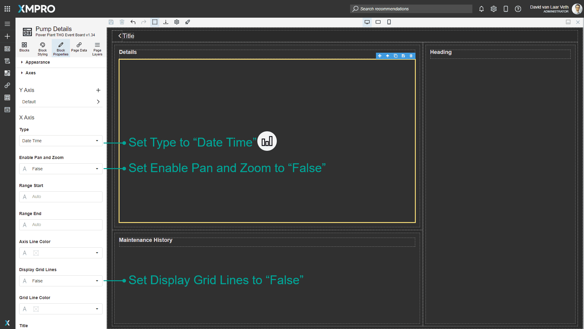 In the Axes accordion item, change Type to "Date Time", Enable Pan and Zoom to "False" and Display Grid Lines to "False".