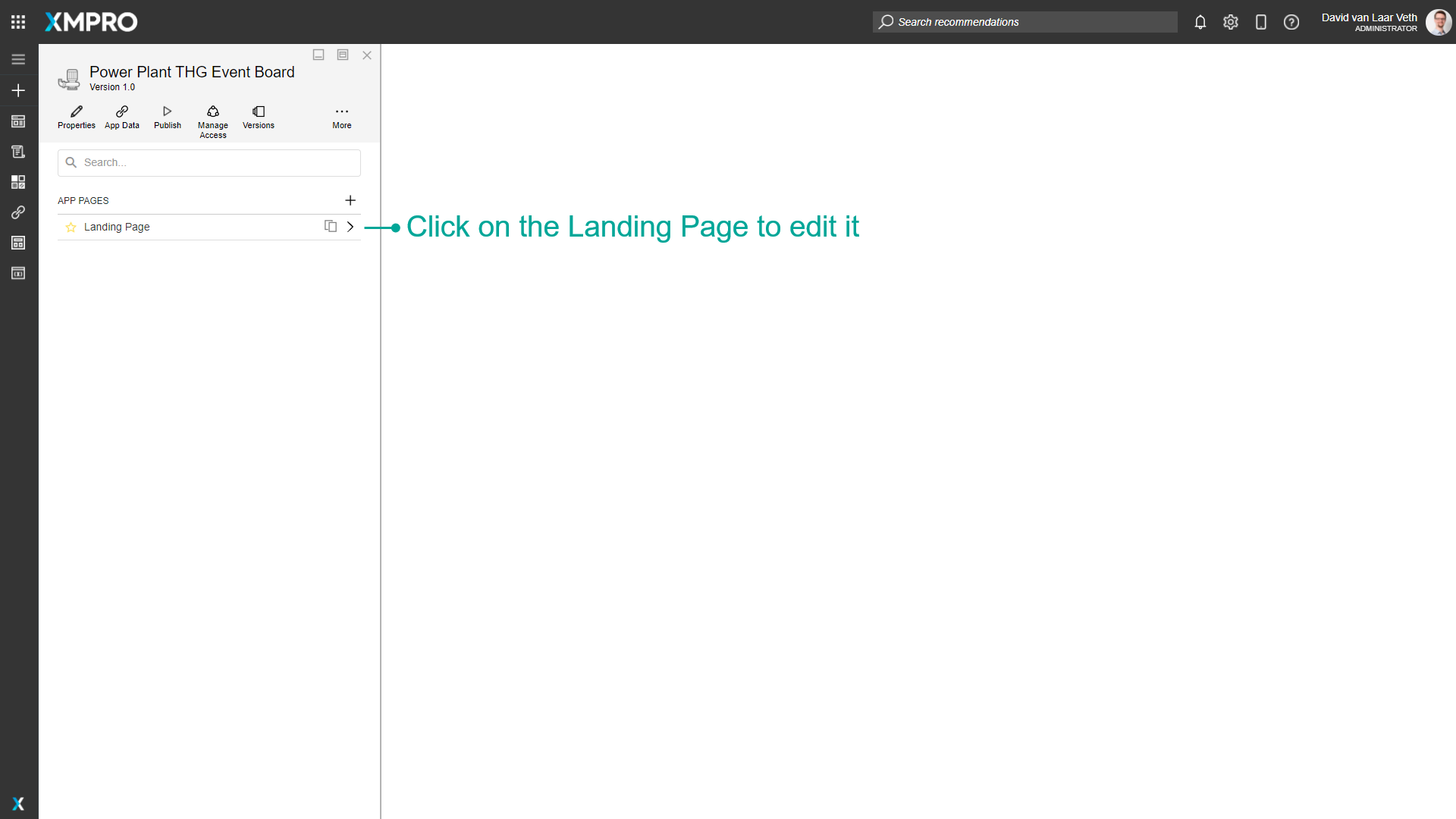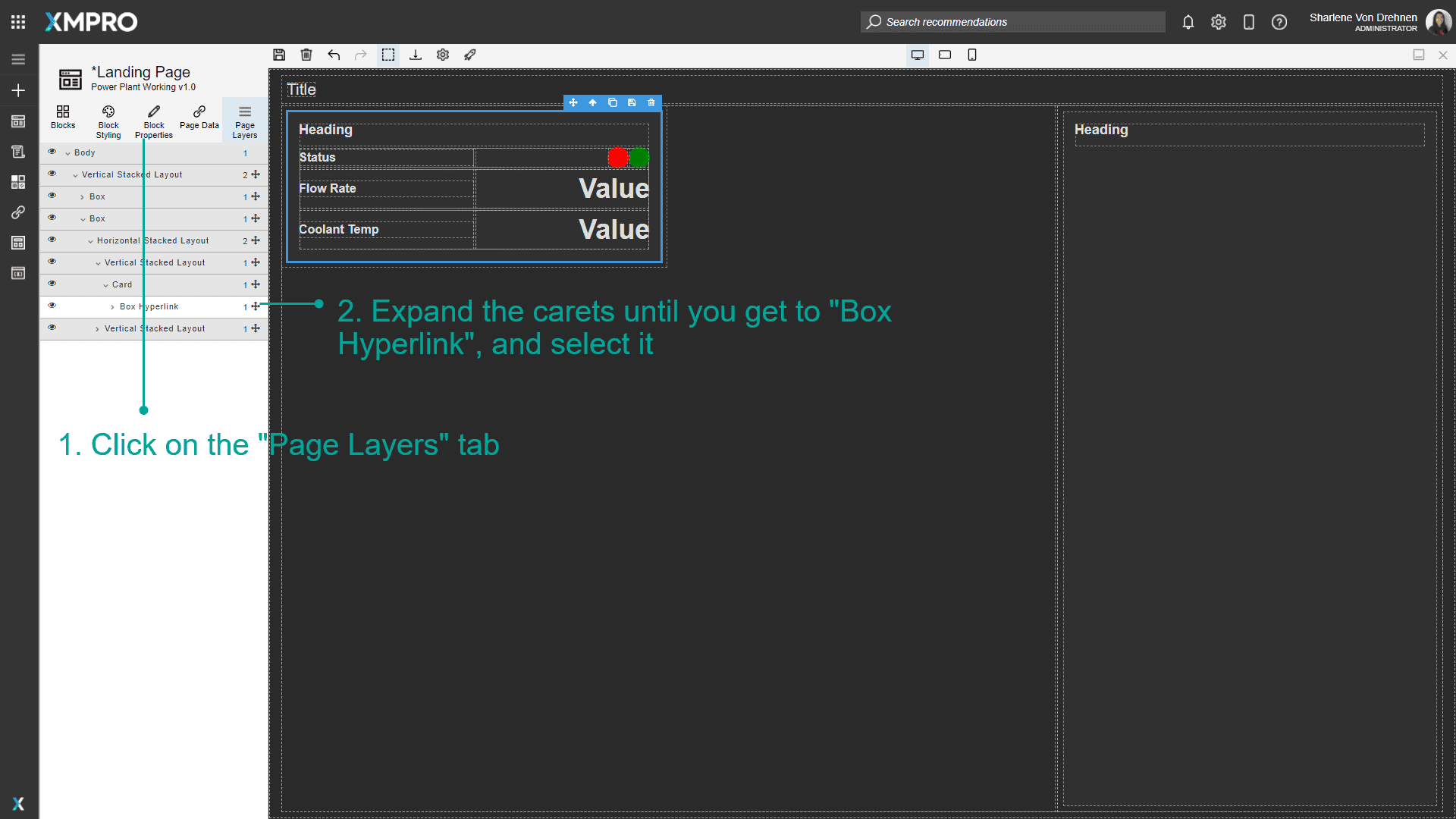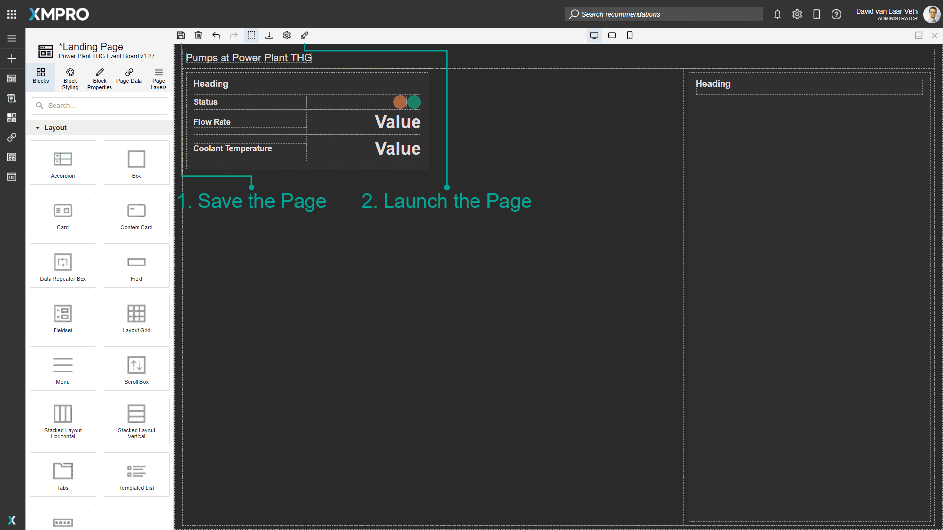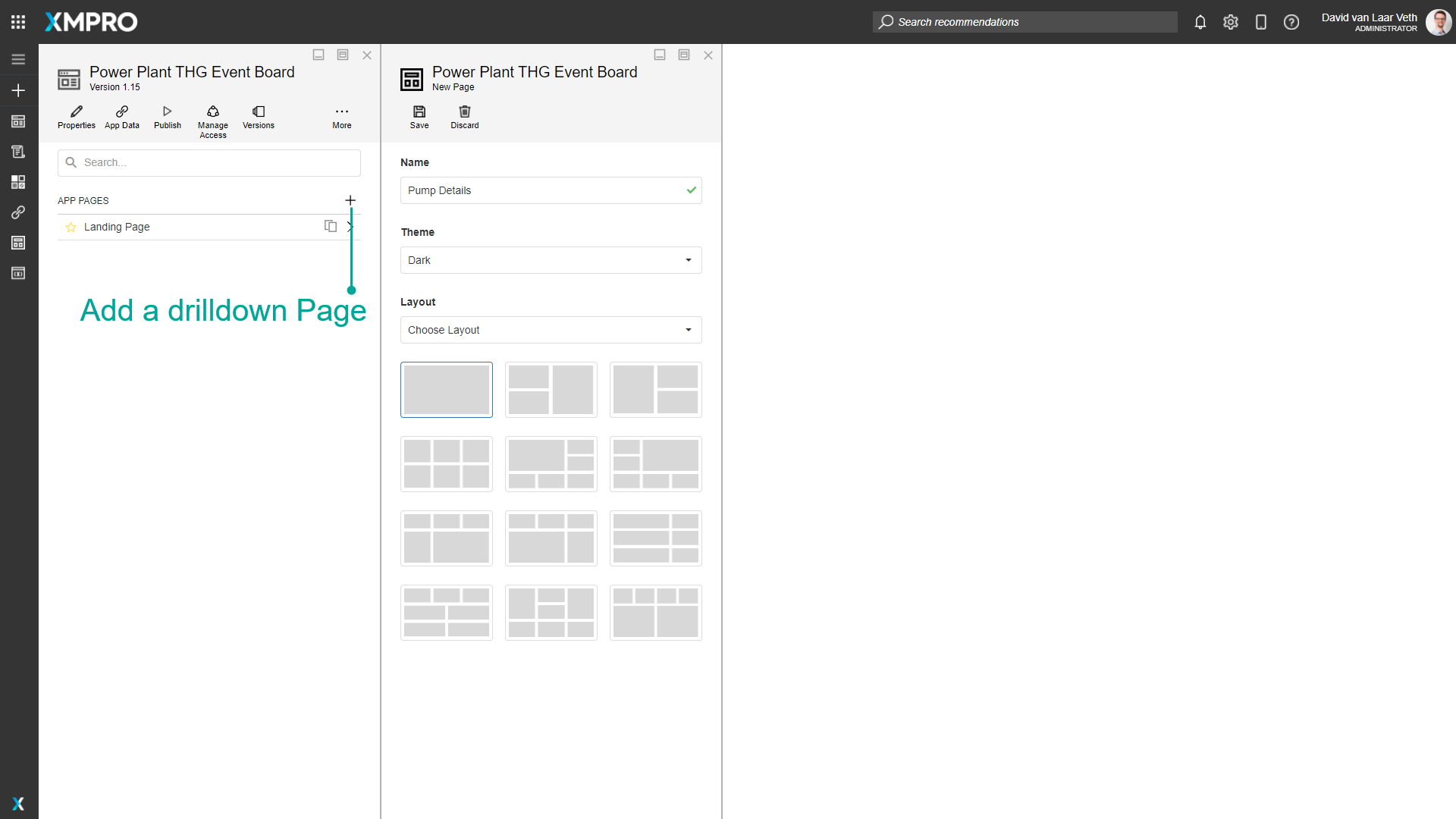 To link to the newly created Pump Details Page when clicking a card, close the page and open the Landing Page again. You can click and drag the grey header of the page to the right to see the list of pages.