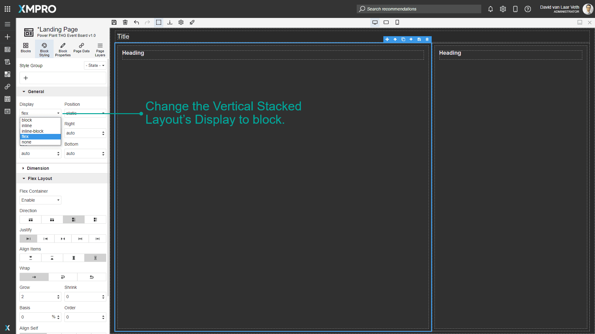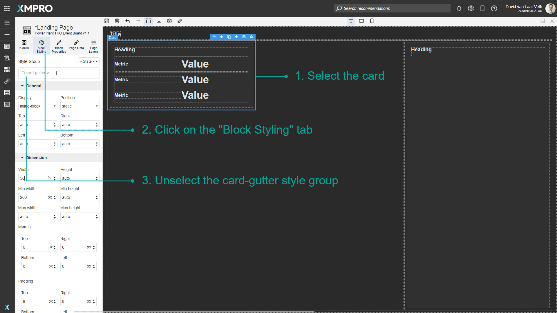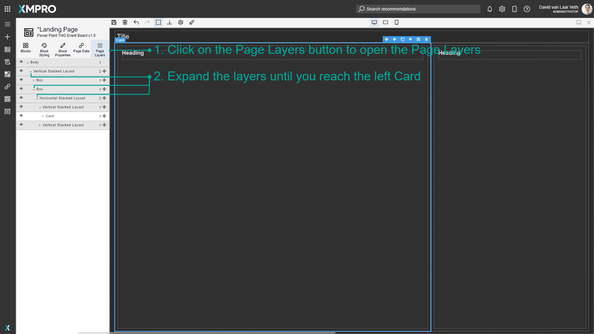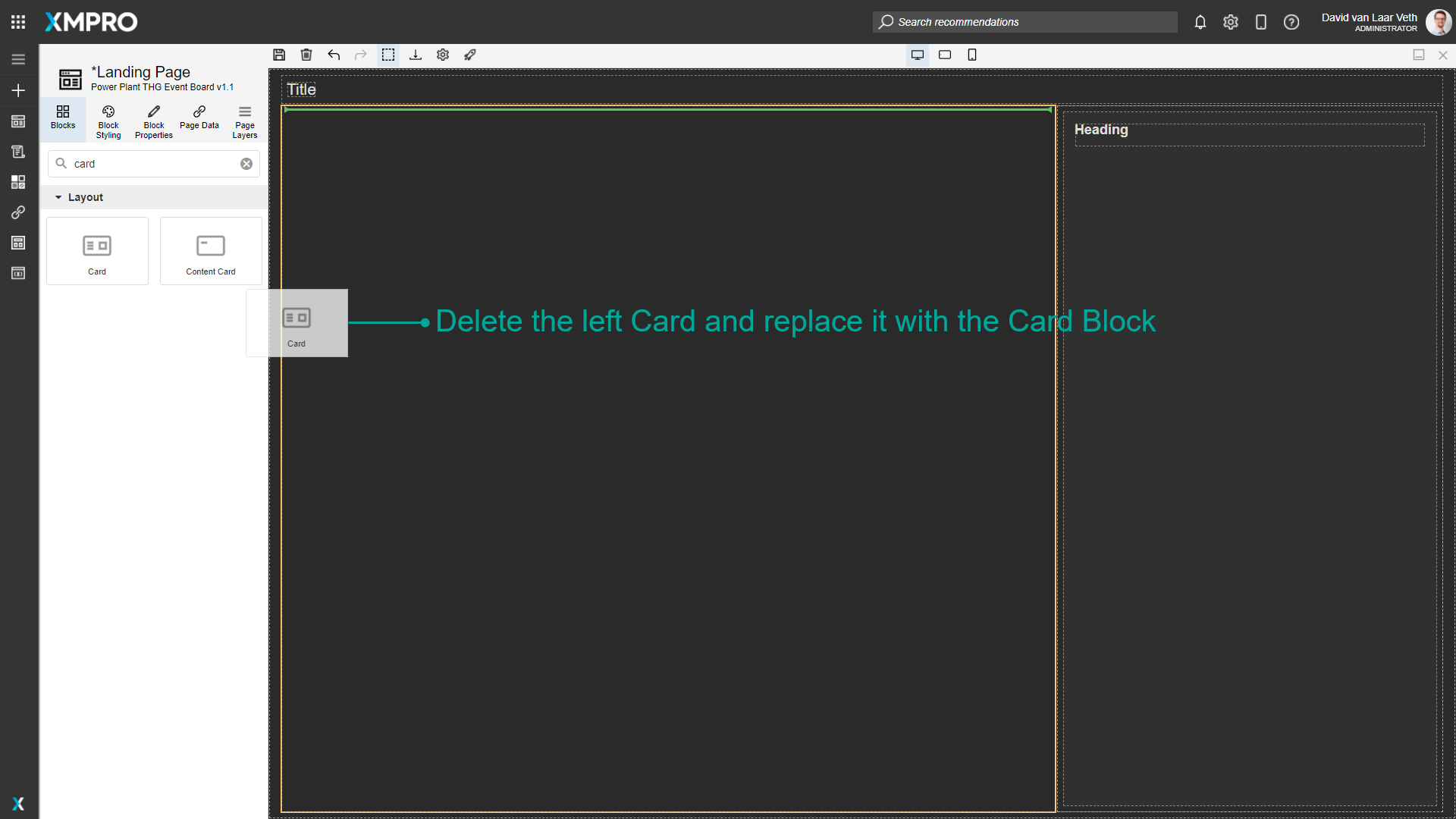- Select the block (in this case the Heading of the card) through the canvas or Page Layers.