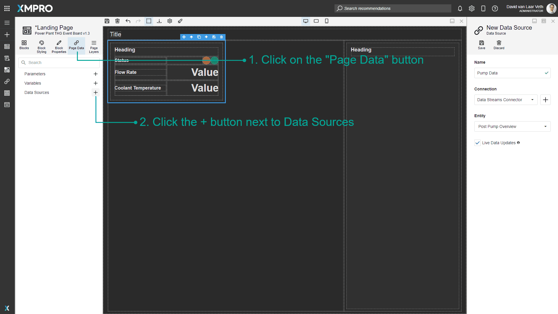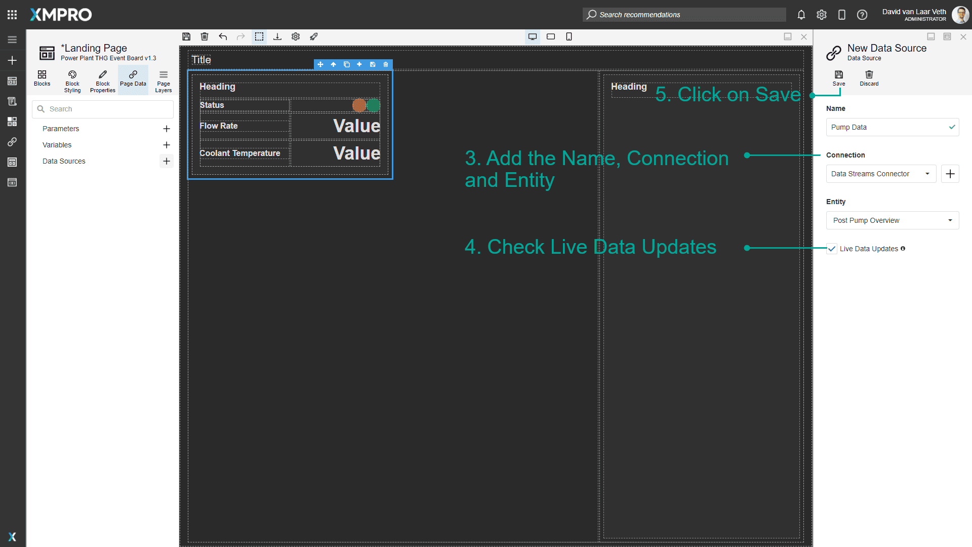 - Add a Data Source with Name as Pump Data, Connection as Data Streams Connector, and Entity as Post Pump Overview.