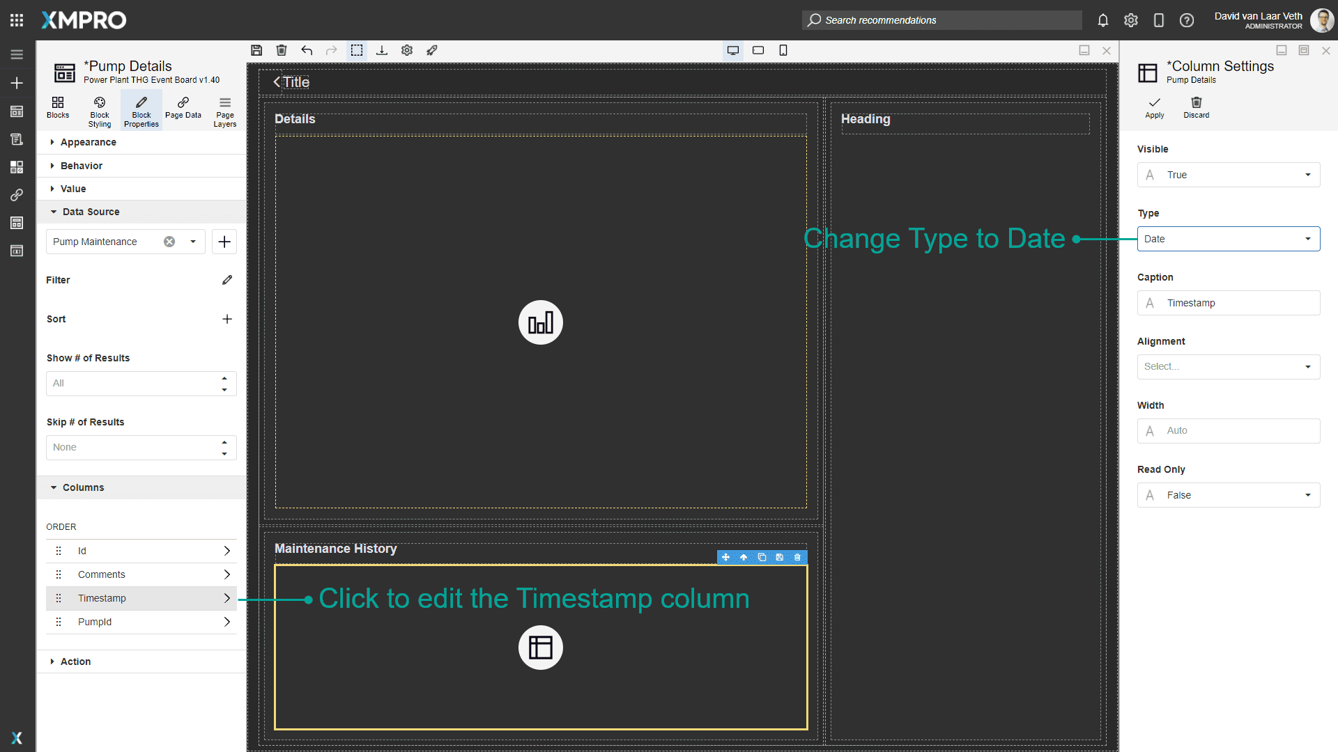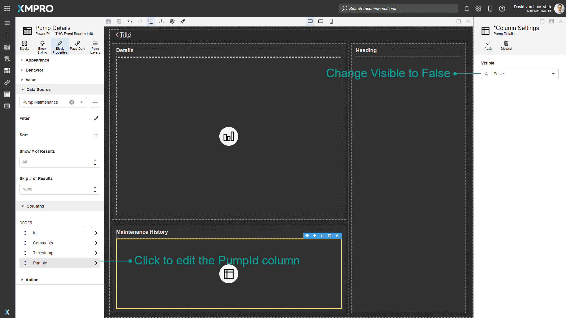 We don't want to show the PumpId, as it will always be the same. To hide it, click the "PumpId" row in the list and change the Visible property to "False". Apply the changes to the column.