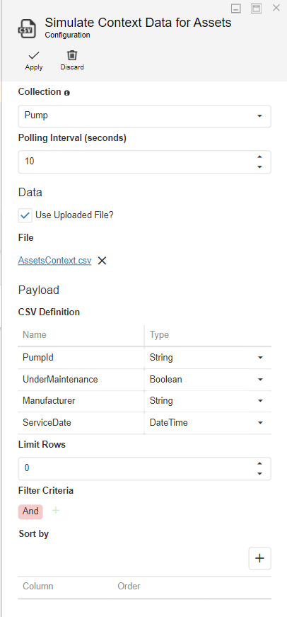 There is often metadata associated with assets that is not part of the live data from the sensors. In this case, metadata includes whether the pump is currently under maintenance, the manufacturer, and the last service date. We must retrieve this data from elsewhere. In a production environment, this might be an SAP EAM system, but for this example, we can achieve this through the CSV Context Provider Agent.