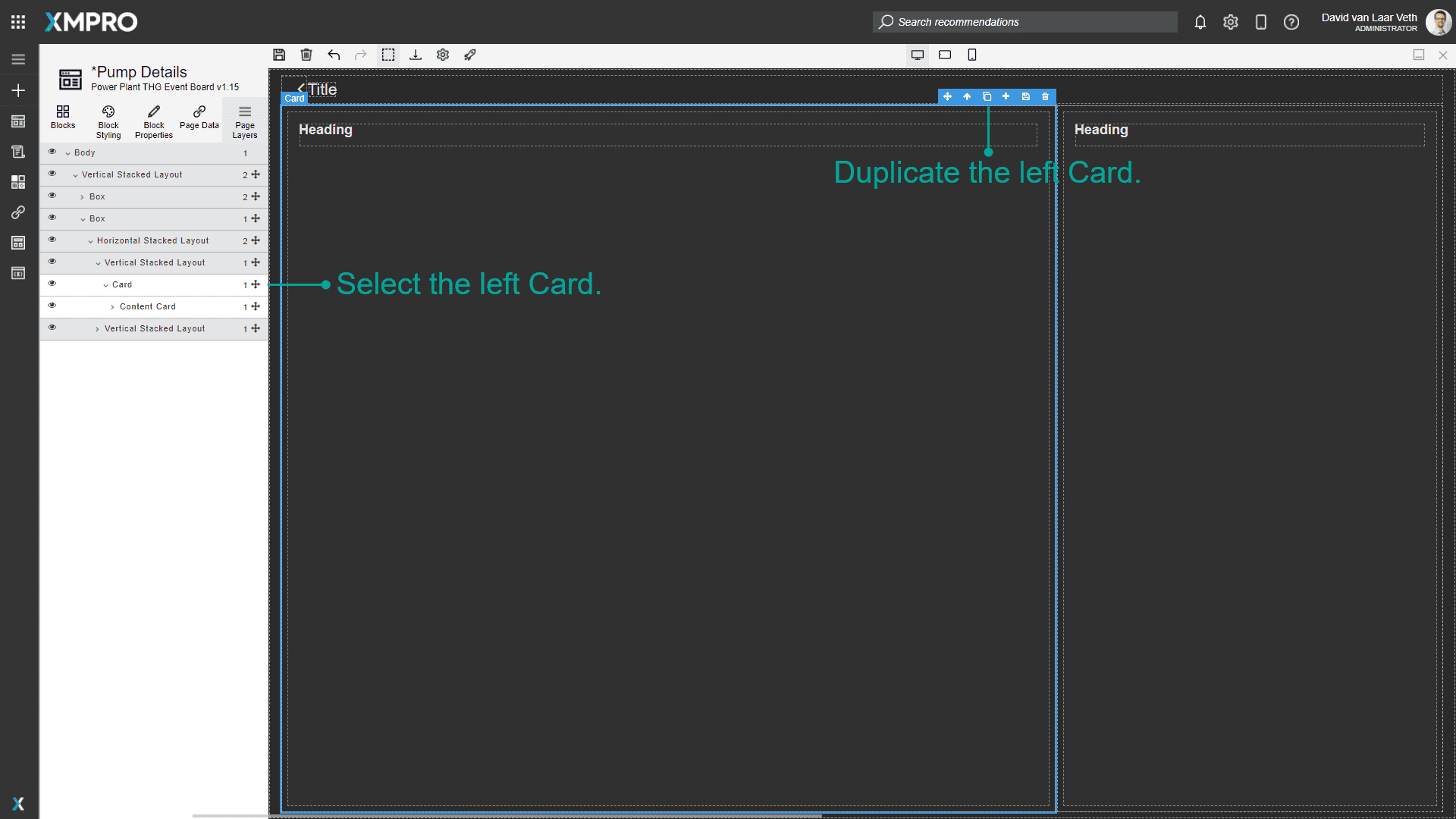 We want two cards inside the Left Vertical Stacked Layout, so select the left Card and duplicate it.