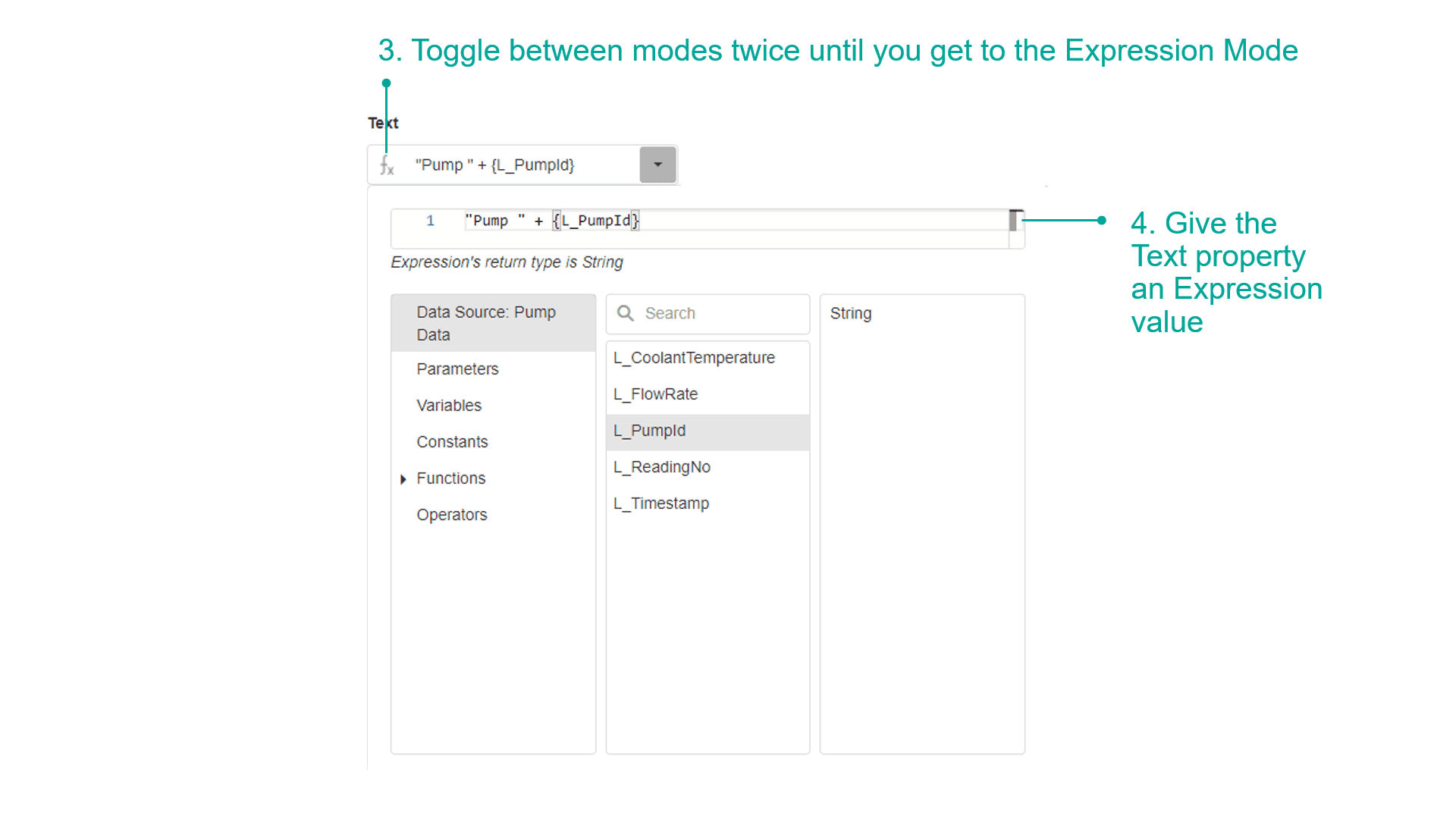 - When adding an expression for the "PumpId", press the button on the left of the Text property field to toggle between Static, Dynamic and Expression value modes. Change the mode to Expression so you can enter an expression to display the Pump Id that is selected.