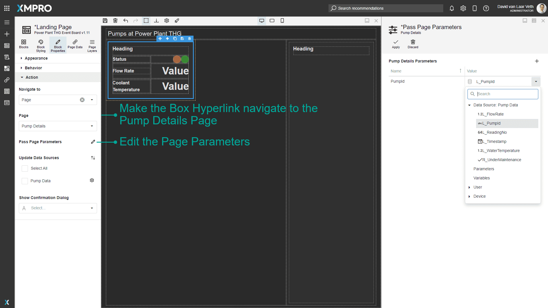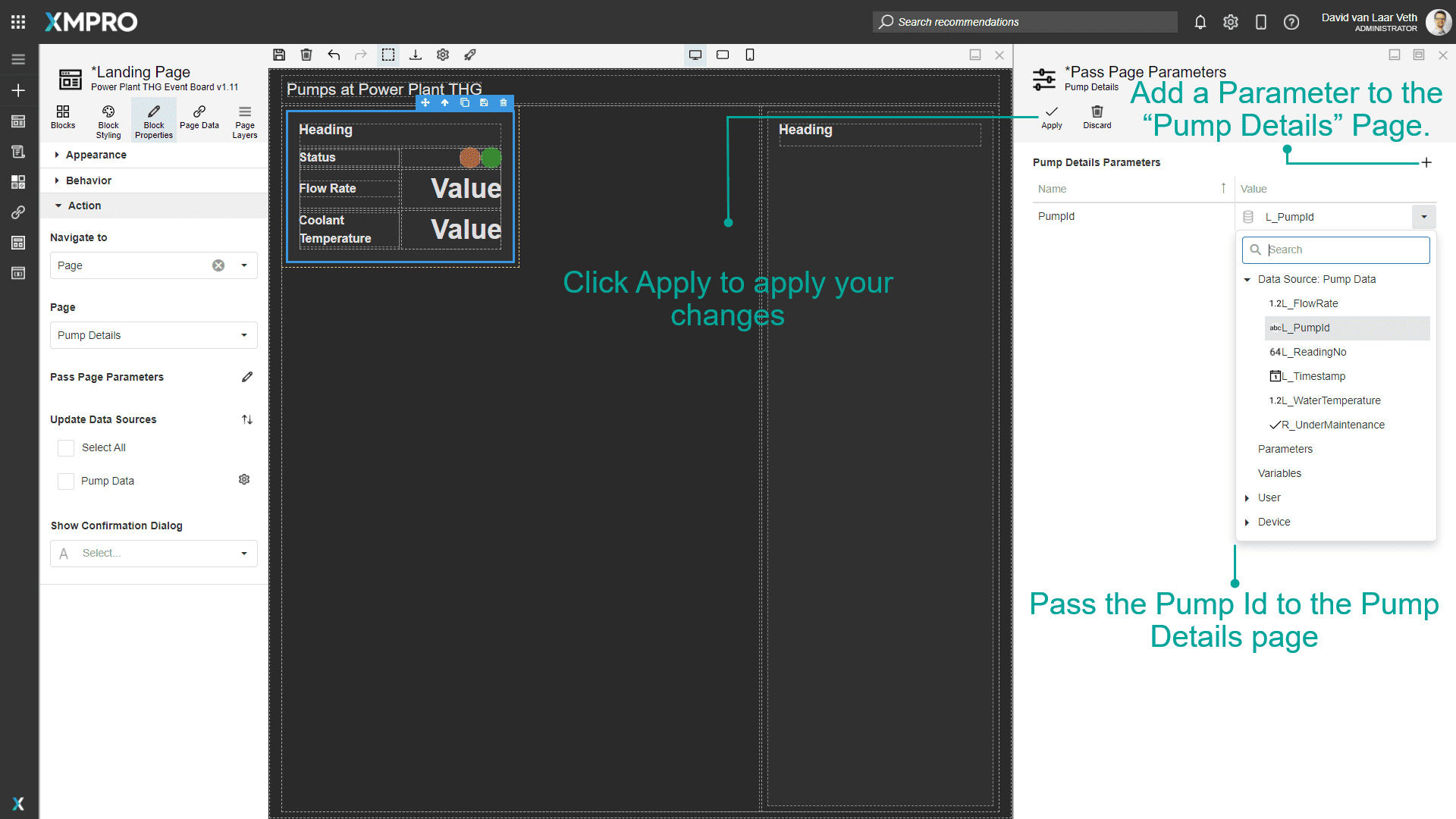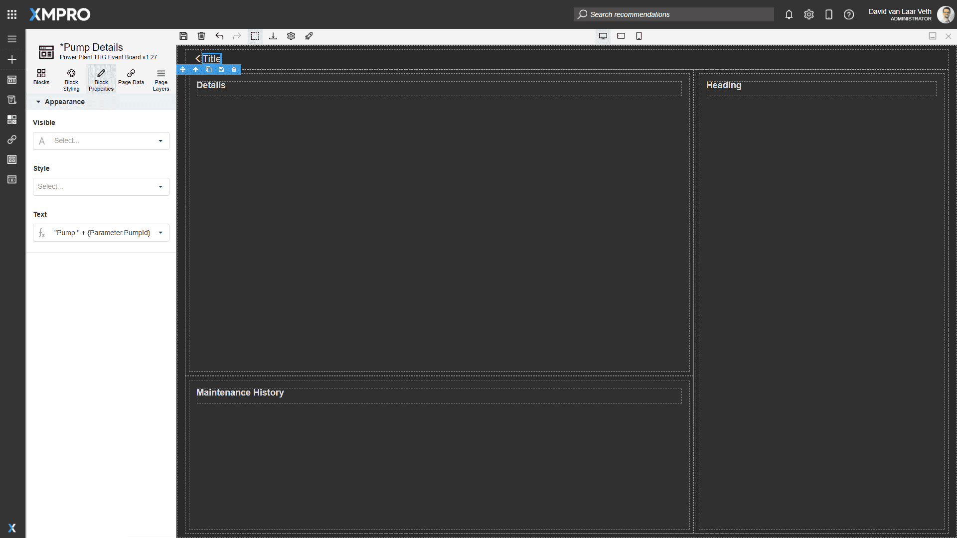 We want the title of the page to be the Pump's name, so change the Title's Text property to an expression value "Pump " + {Parameter.PumpId}.