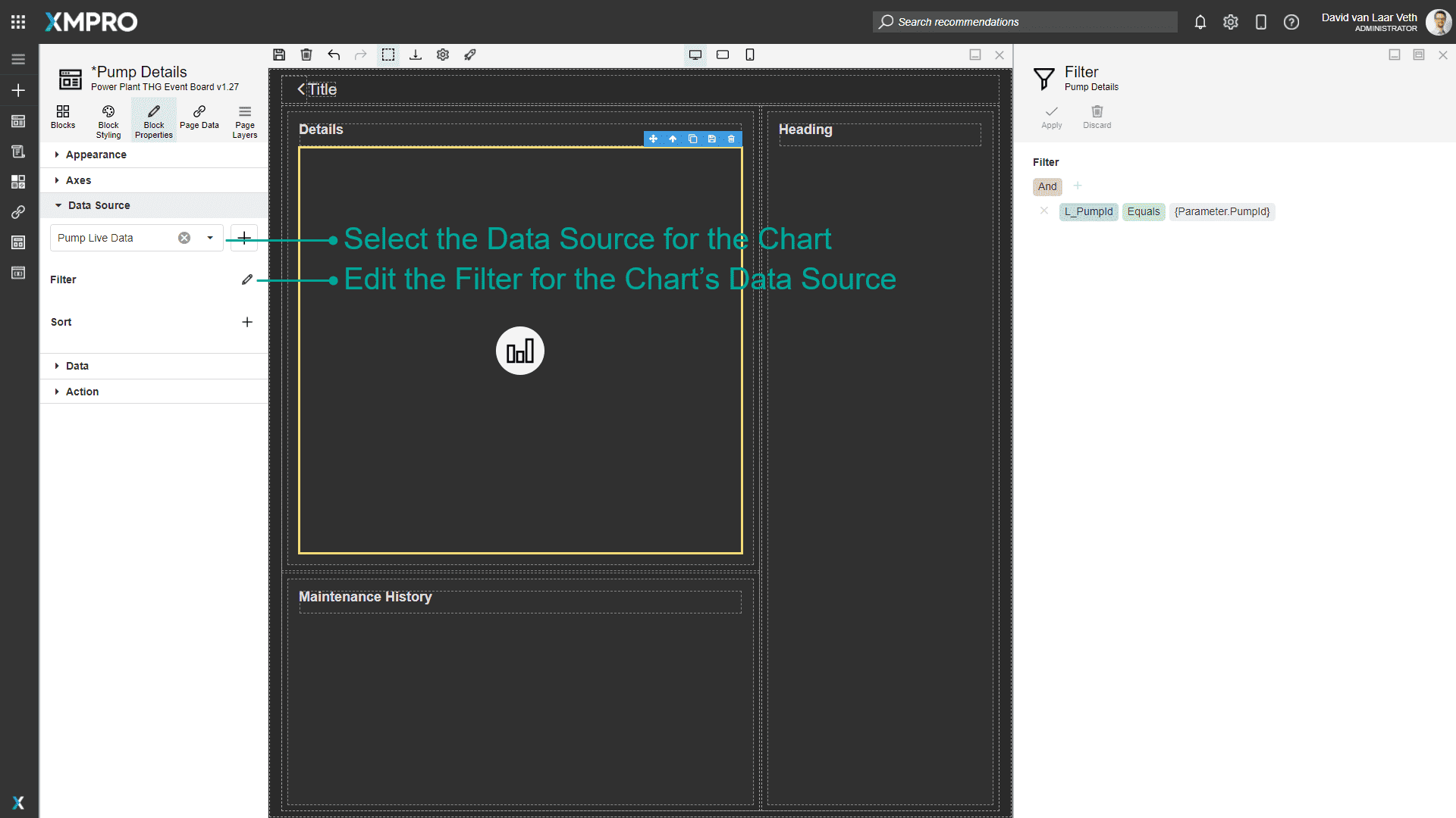 Drag a Chart into the Details card. Highlight the Chart, and in the Block Properties tab, set the Data Source of the Chart to "Pump Live Data".