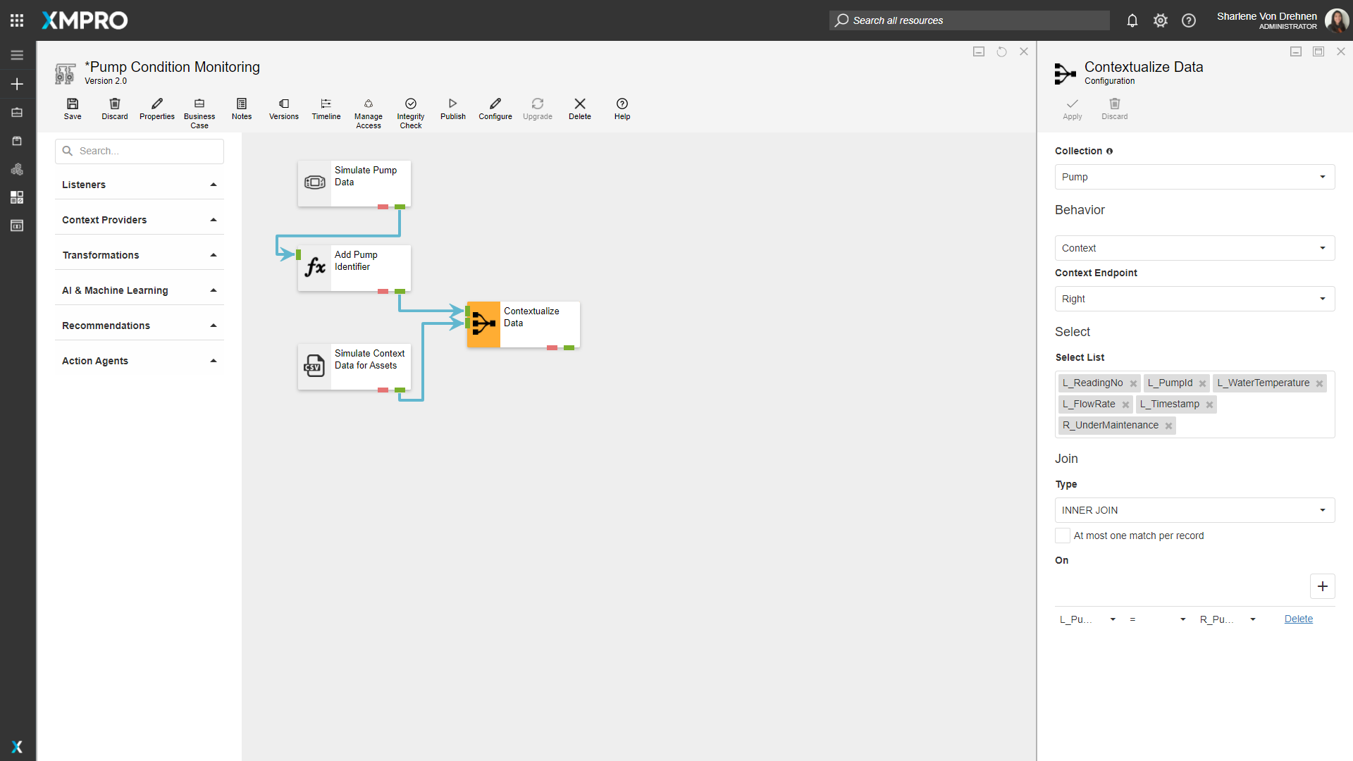 The "Contextualize Data" Join will join together the data from the CSV Context Provider and the Calculated Field using the PumpId as the common field. Configure it as follows: