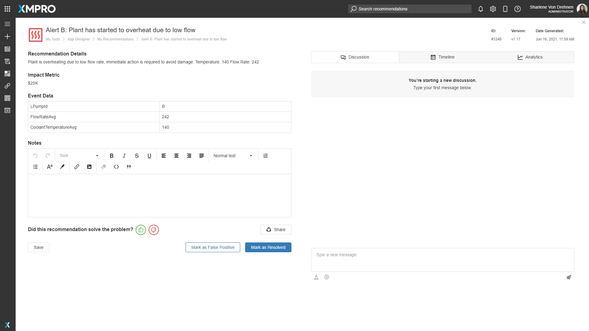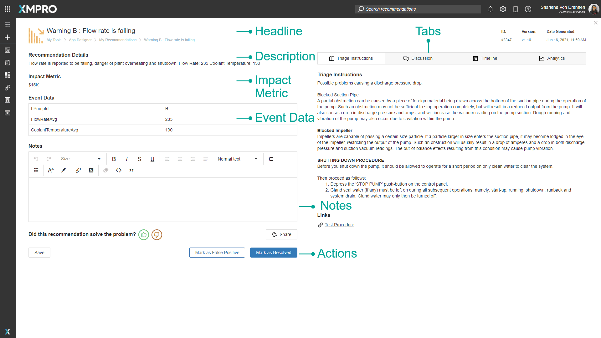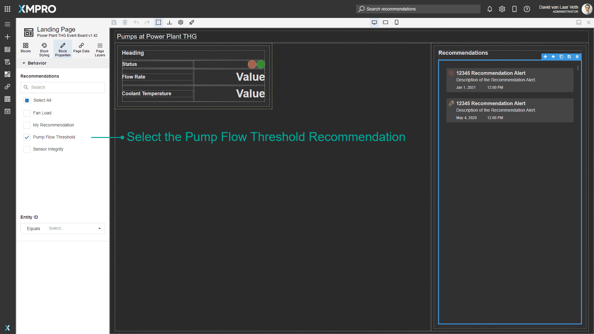 To filter the Recommendation Alerts to the relevant ones only, select the "Pump Flow Threshold" in the Block Properties of the Recommendations Block on both pages.