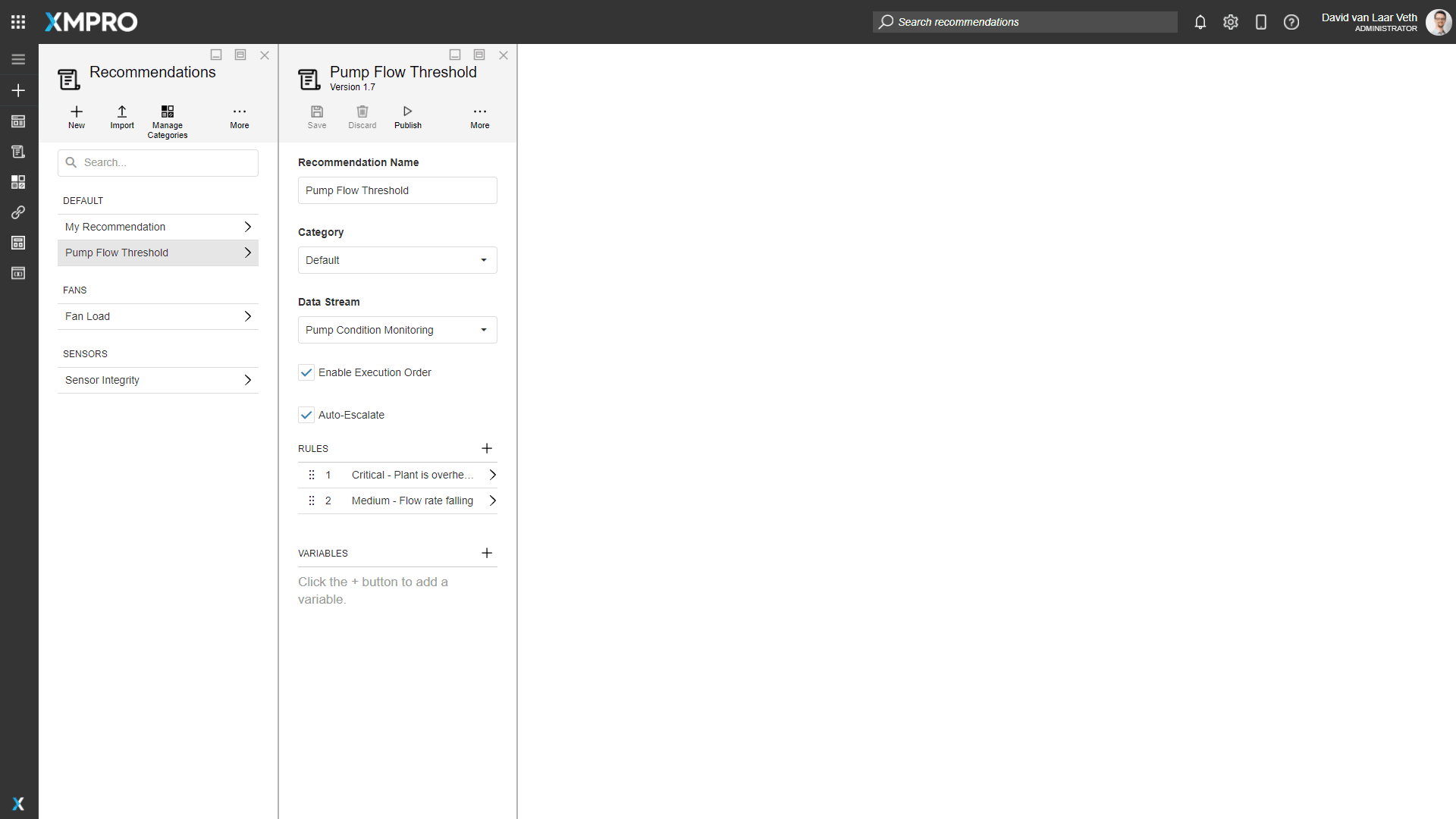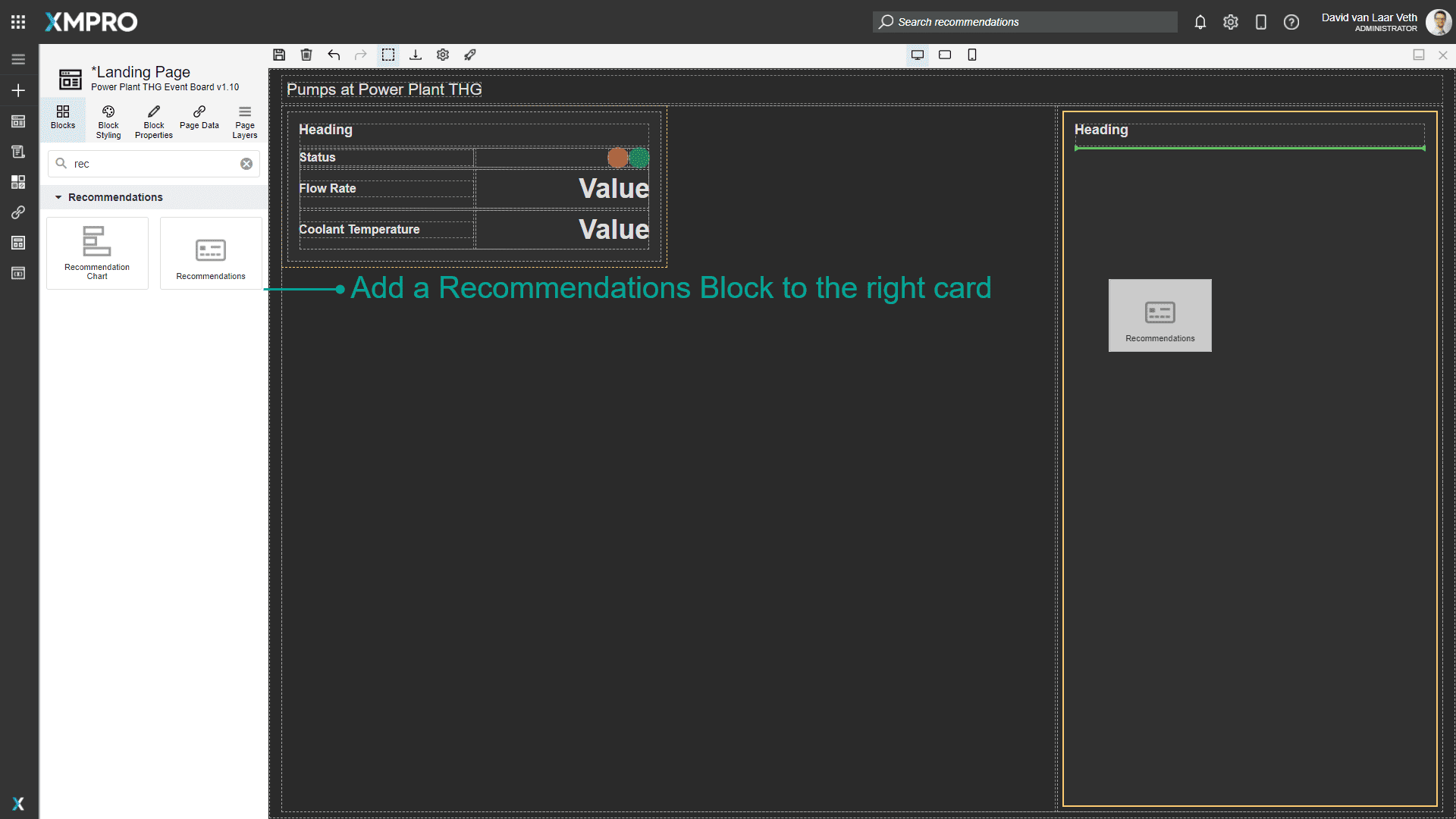 We want engineers to be able to see and respond to Recommendation Alerts from this App, so we should drag a Recommendations Block into the right card of both Pages. Also, rename the heading to "Recommendations".