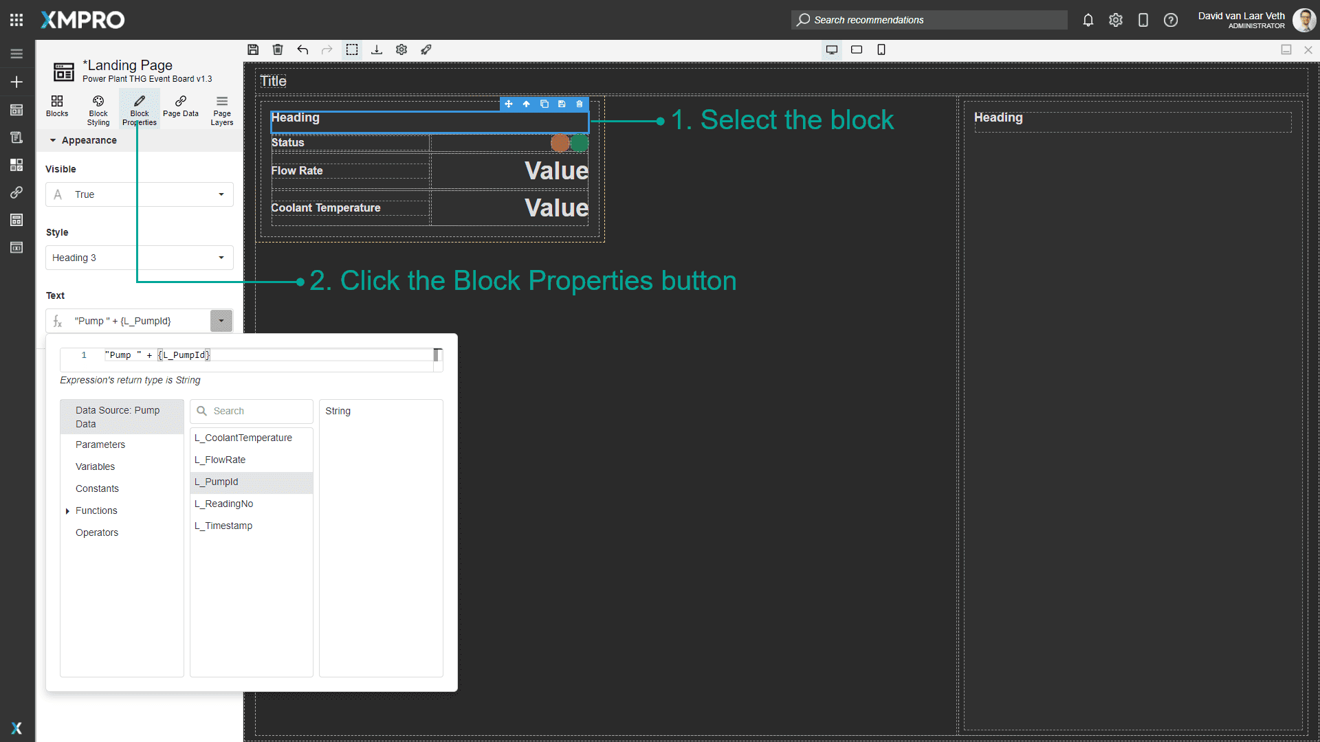 - Give the Heading's Text property an expression value of