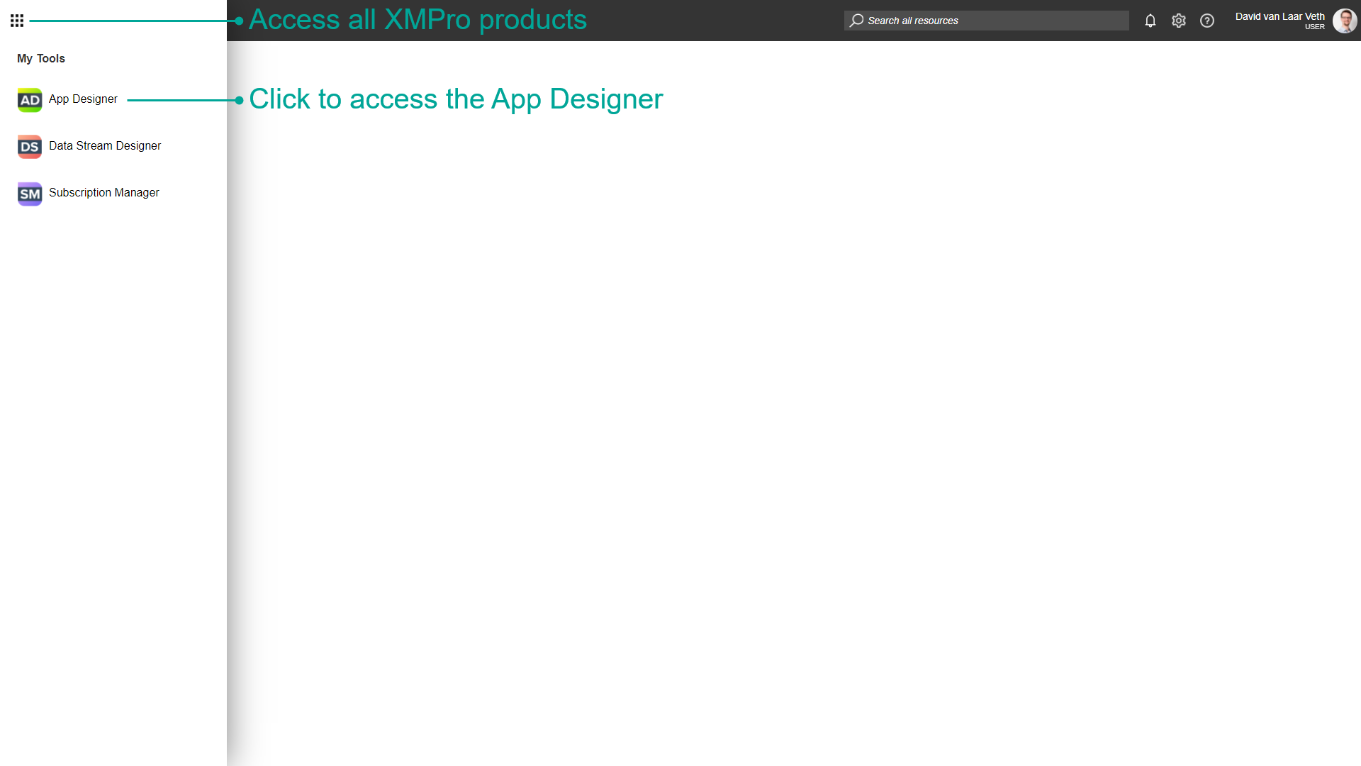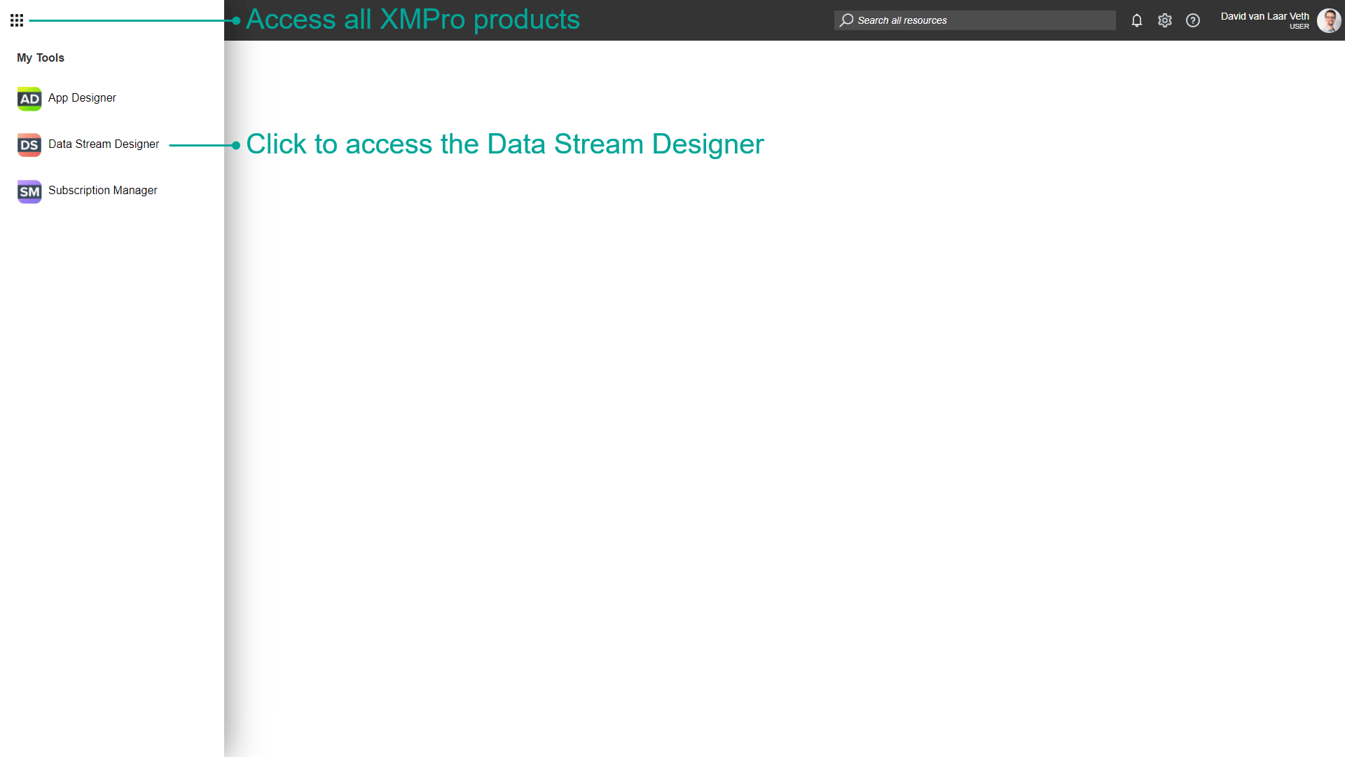 To access the Data Stream Designer, log into your XMPro Account and press the button in the top-left corner of the screen and click on the Data Stream Designer item.