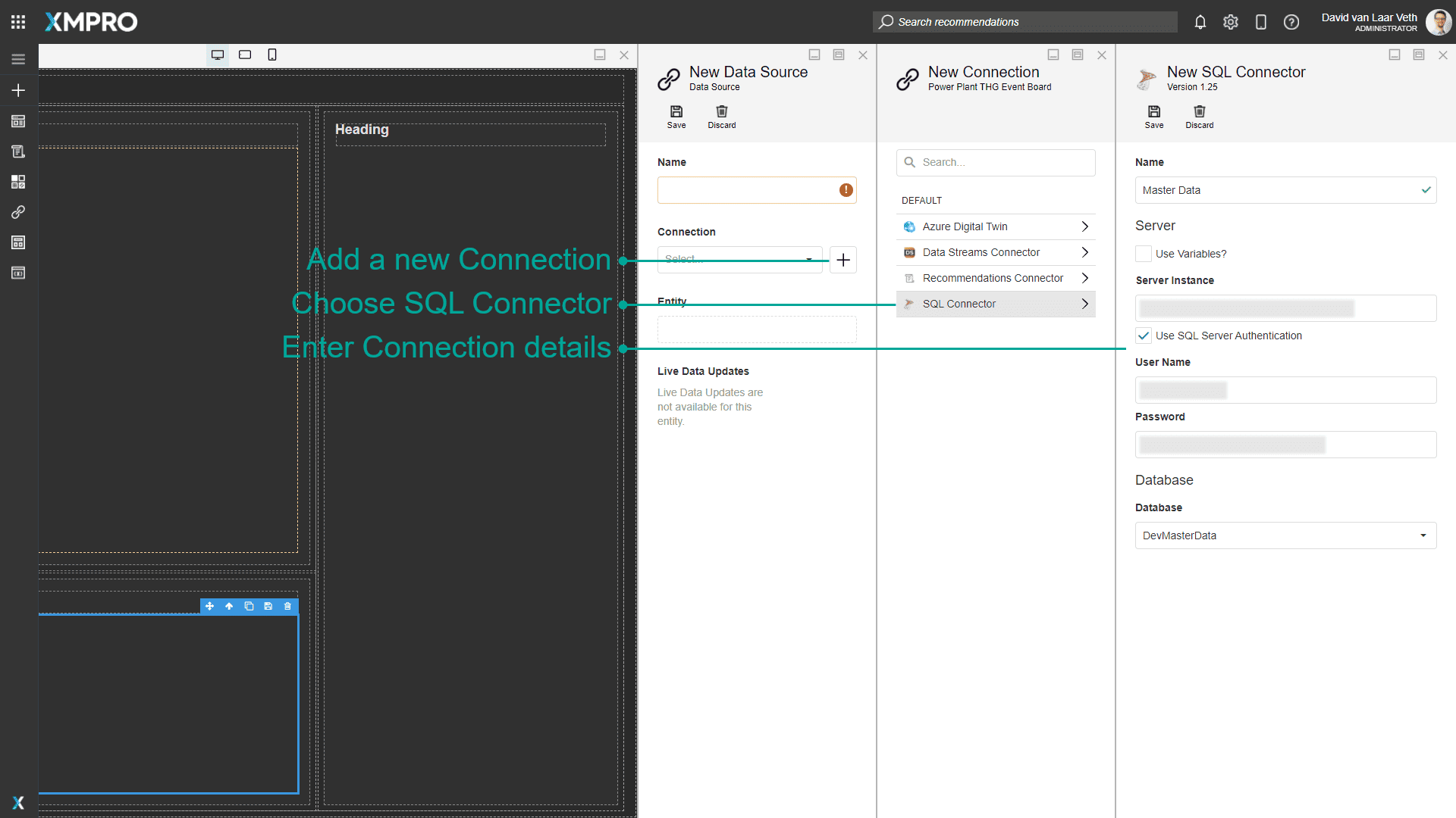 Give the new SQL Connector a Name, enter your own connection string, User Name, and Password, and choose a Database. If you are using the Free Trial, you can get these details in your welcome email. XMPro sets up a 2GB database for you to use during the 120-day trial period.