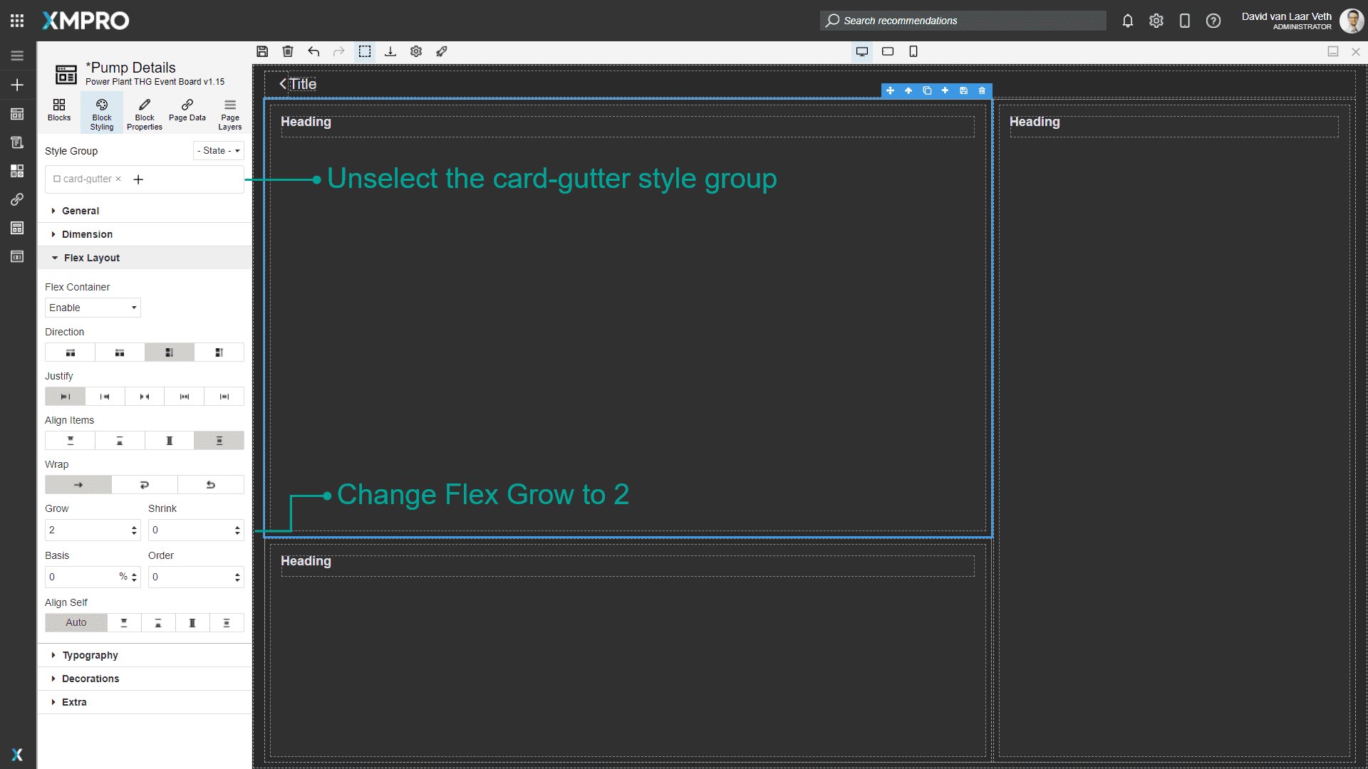We want the top left card to be twice as tall as the bottom left card, so change the top left Card's Flex Grow property to 2 in the Block Styling. Remember to uncheck the card-gutter style group to make the style only apply to the selected element.