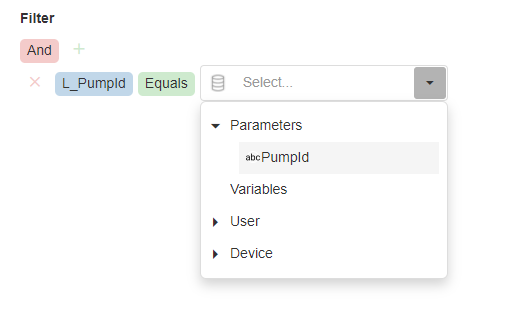 Add a Filter to the Data Source of L_PumpId Equals {Parameter.PumpId}. Click on the "plus" button to start adding the filter.