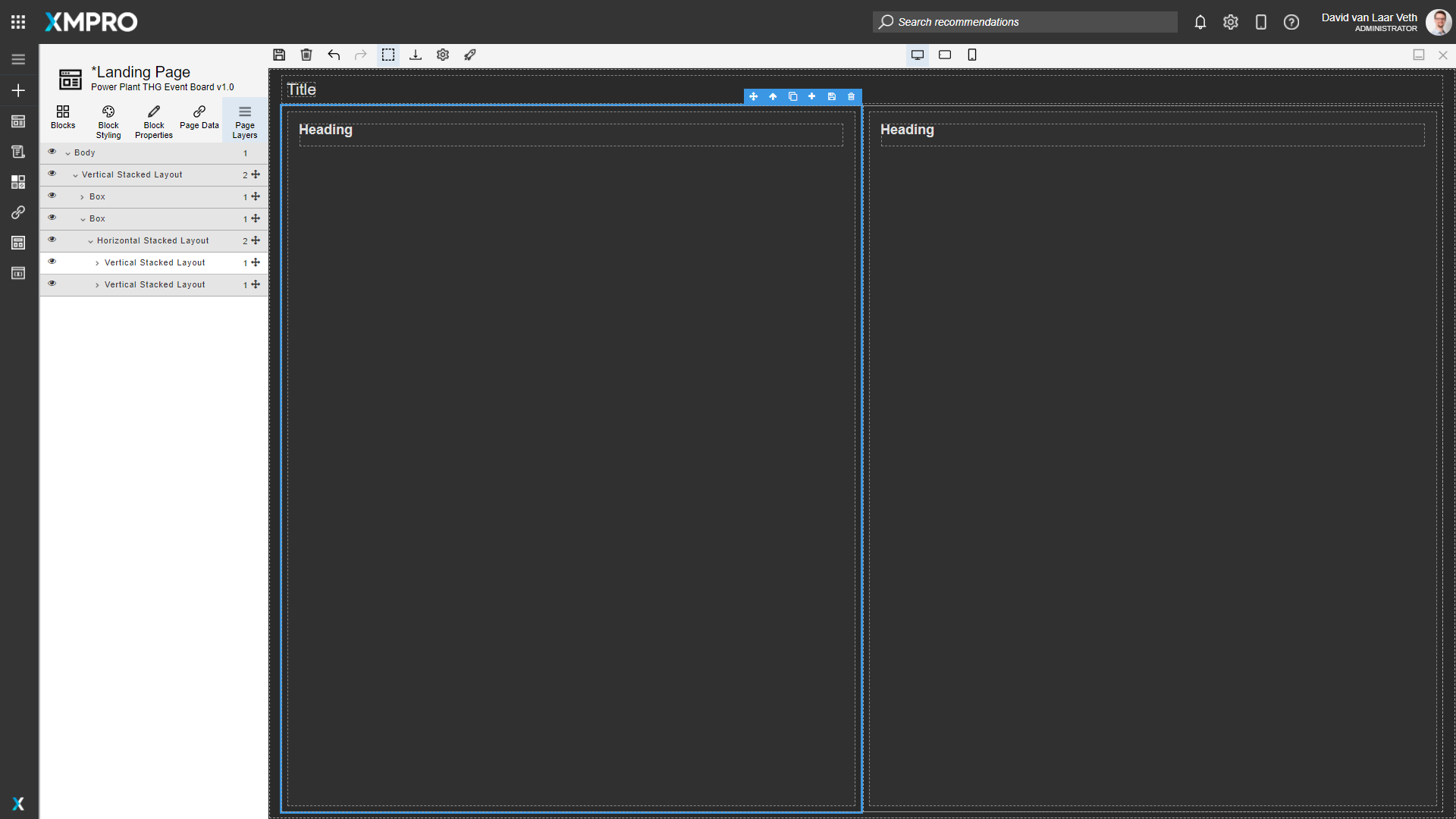 We want a similar layout for this page, so follow the steps from the Landing Page to duplicate the Vertical Stacked Layout, and make the left side twice as wide as the right side. See the instructions that previously showed how to do this.