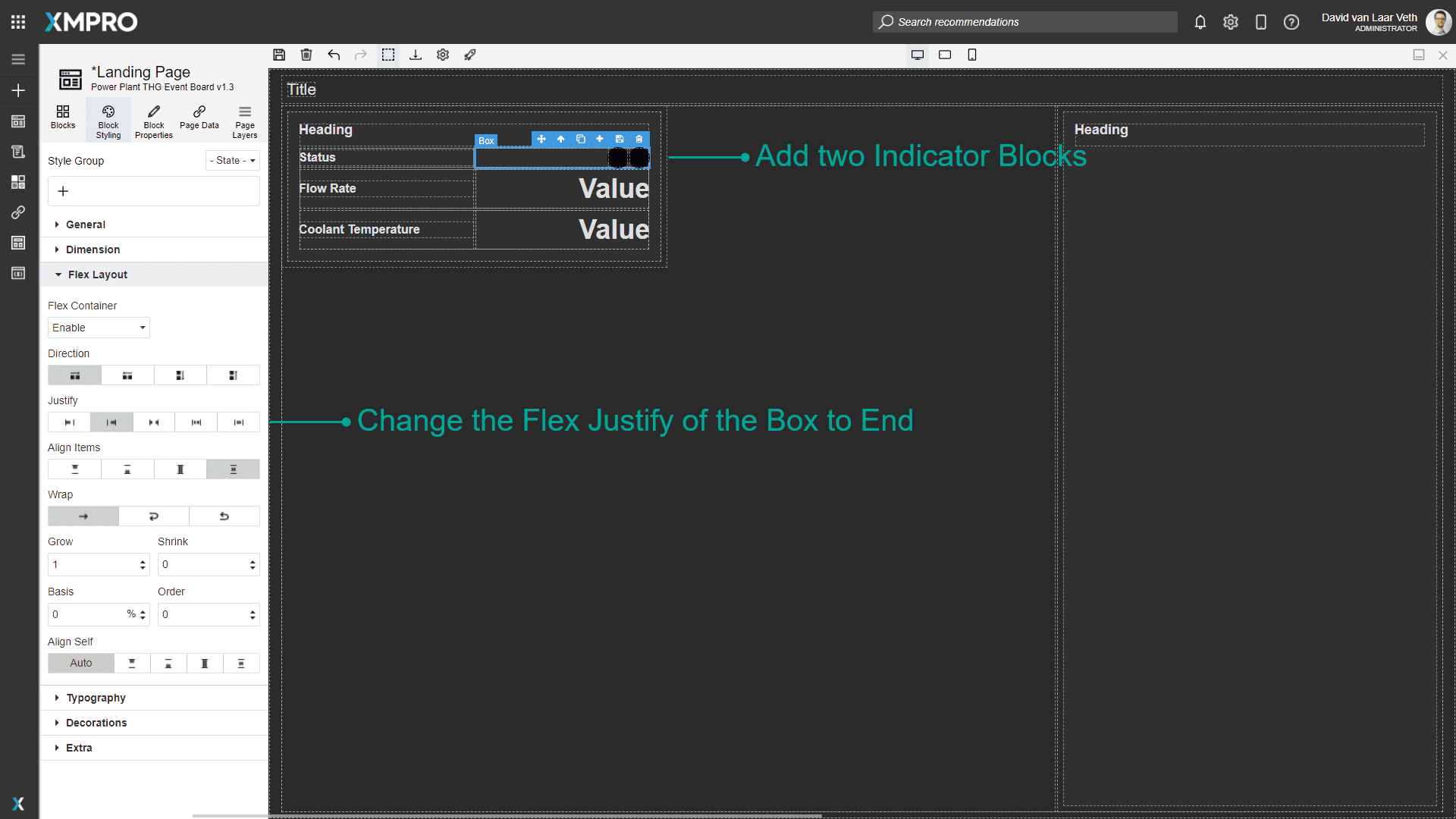 Drag two Indicator Blocks from the Blocks tab into the deleted Value text item's box. Click the Box and change the Flex Justify to End. This will align the Indicators to the right side of the box.