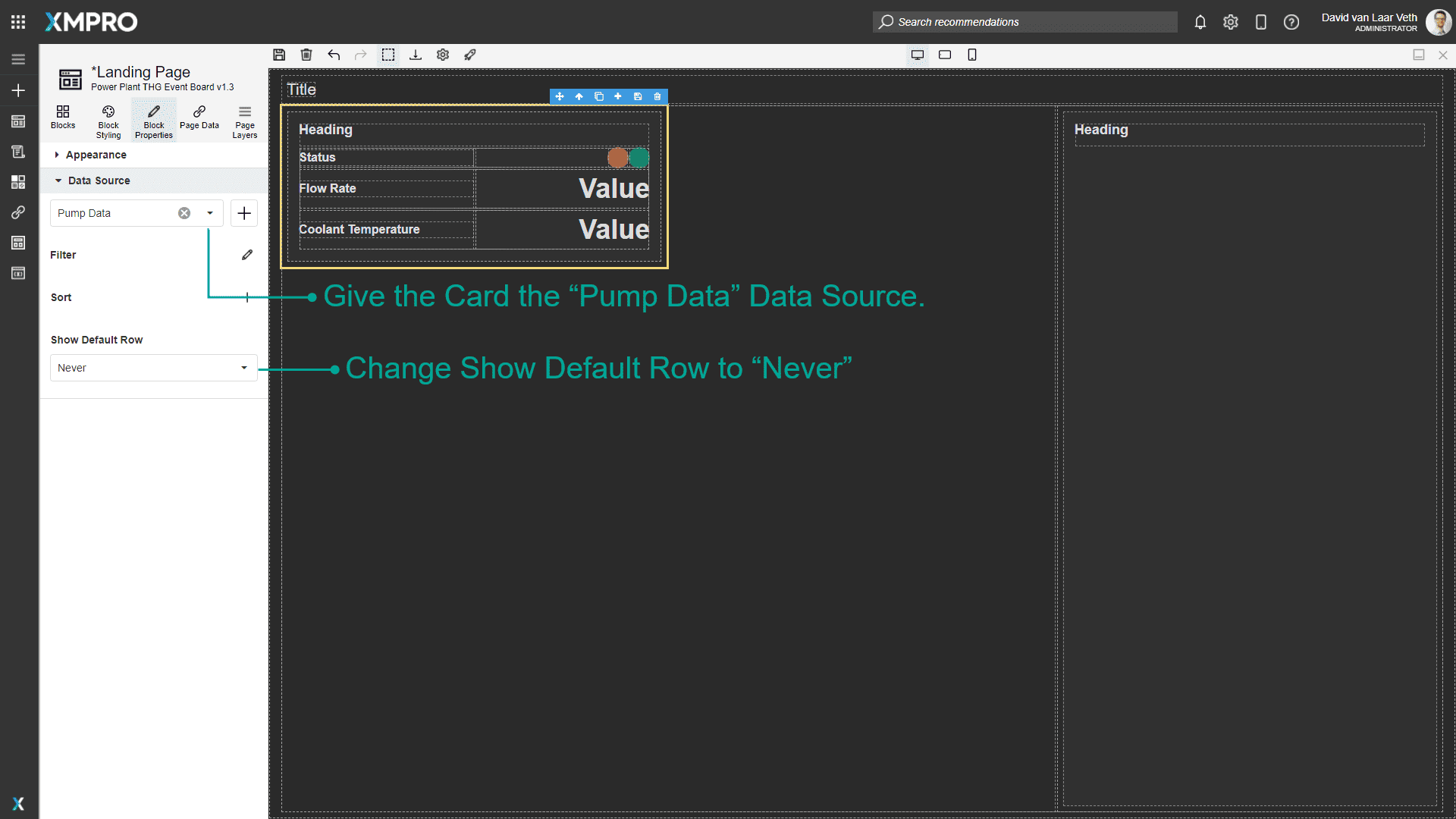 Click the Card and set the Data Source in the Block properties tab to Pump Data. Set Show Default Row to Never, as we don't want an empty card at the end. You can also open the Page Layers tab and look at the highlighted Block to confirm that the correct Block is selected.