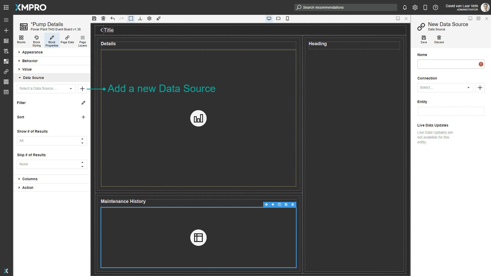 Drag a Data Grid into the Maintenance History card and edit its Block Properties. Press the + button next to the Data Source select box to add a new Data Source, and name it "Pump Maintenance."