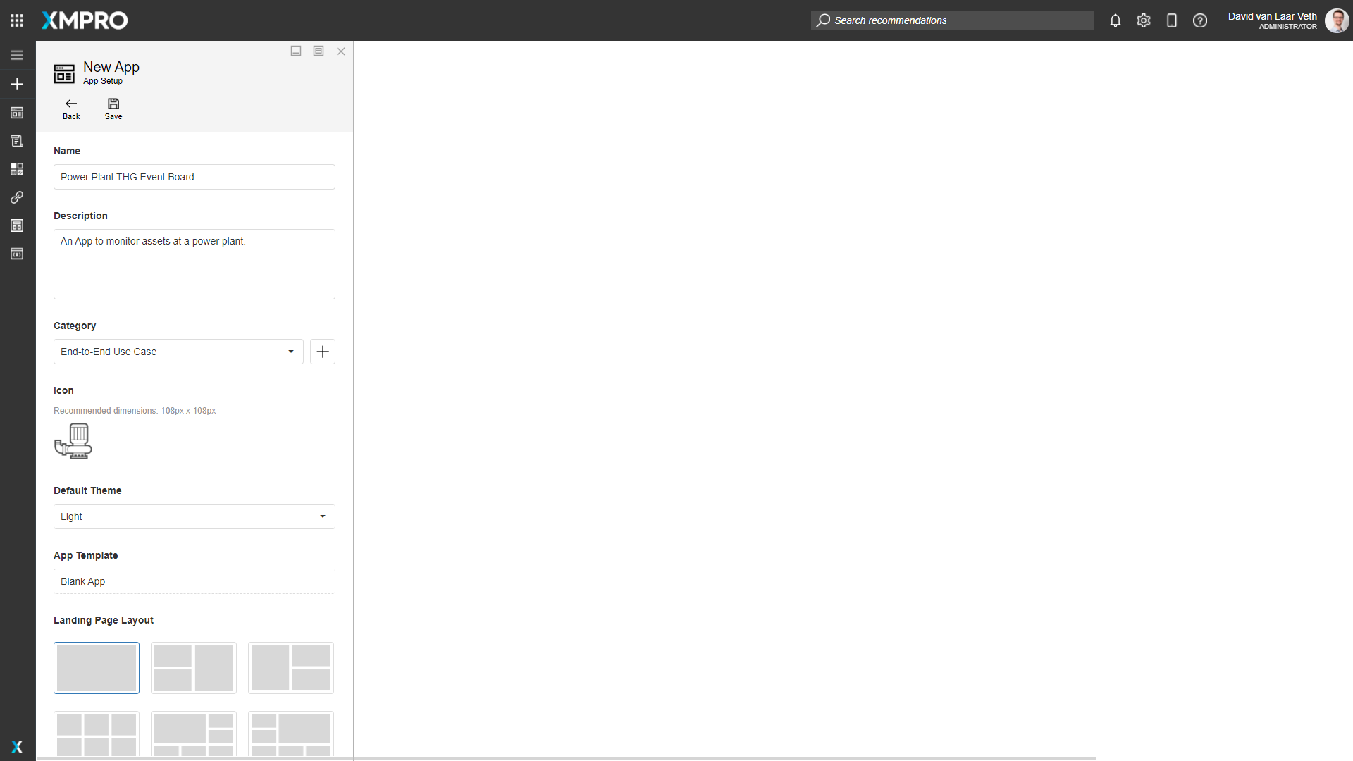 The Engineers want to be able to see a detailed chart and history of each pump when they click on a pump's card on the landing page. To make a new drilldown Page, close the Landing Page, and add a new Page with the + button. Name the Page "Pump Details".