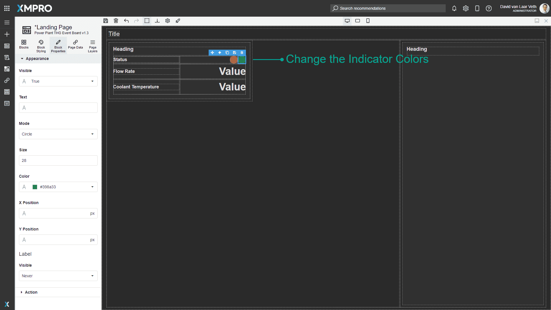The "Status" indicator should be red or green, depending on whether the pump is under maintenance or not. Change the left Indicator's Color in the Block Properties to "#ad6363" (red), and the right to "#398a33" (green).