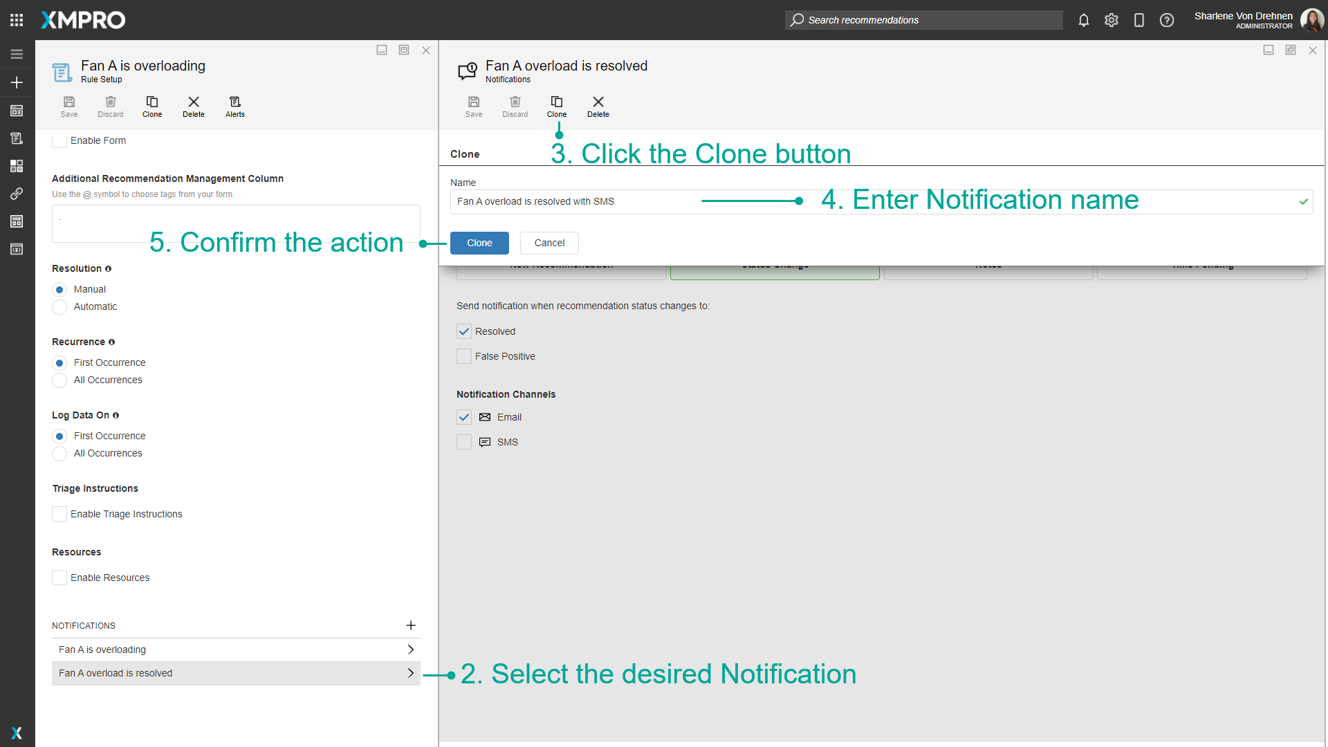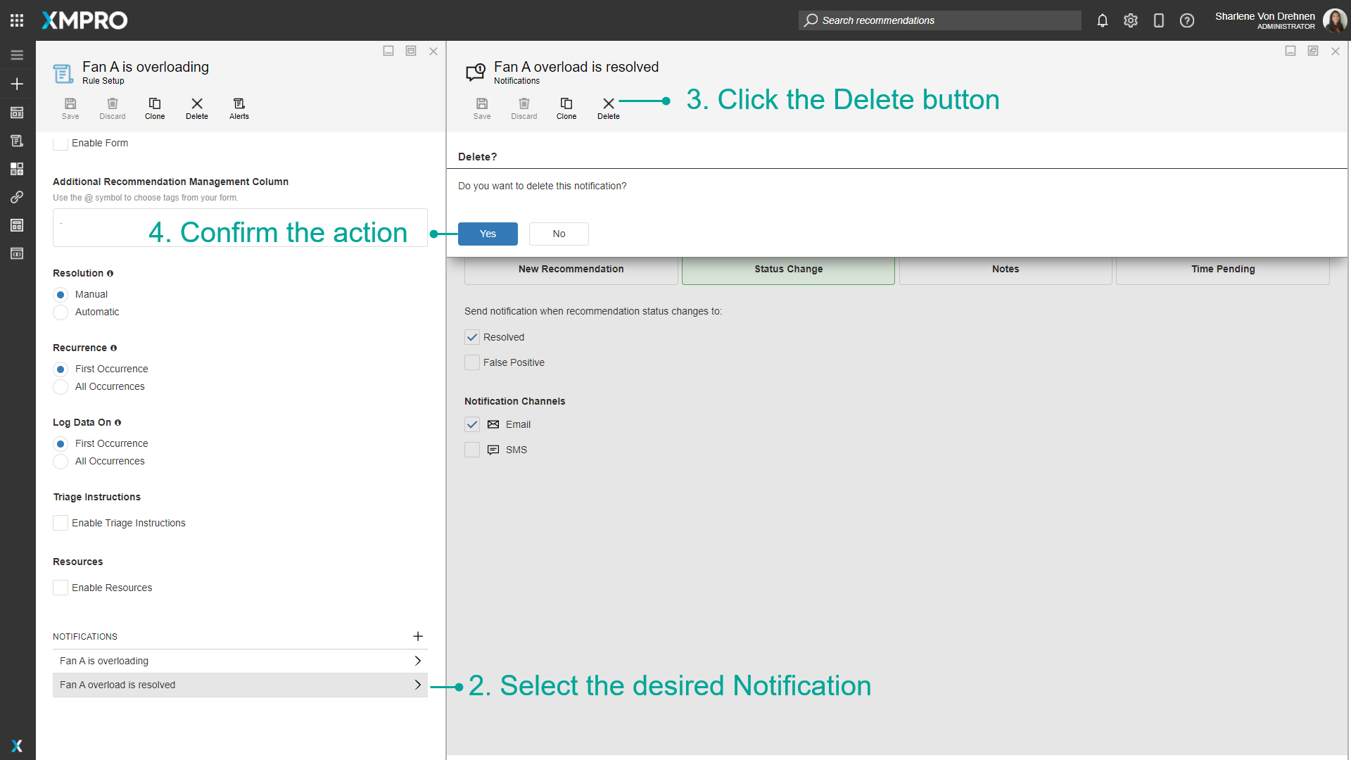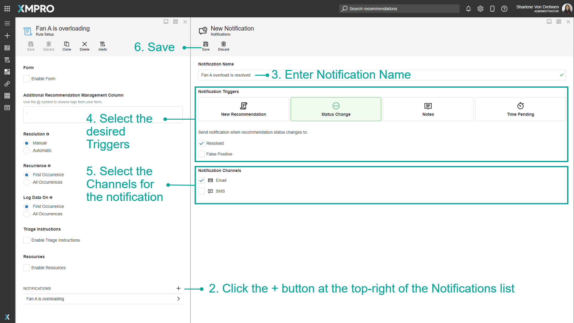 A Notification defines how users will be notified when a Recommendation Alert is triggered by a critical event that meets the conditions set in a Rule. This is useful when you want to send a text, email, or another form of communication to users when something goes wrong and is caught by the Rule's condition.